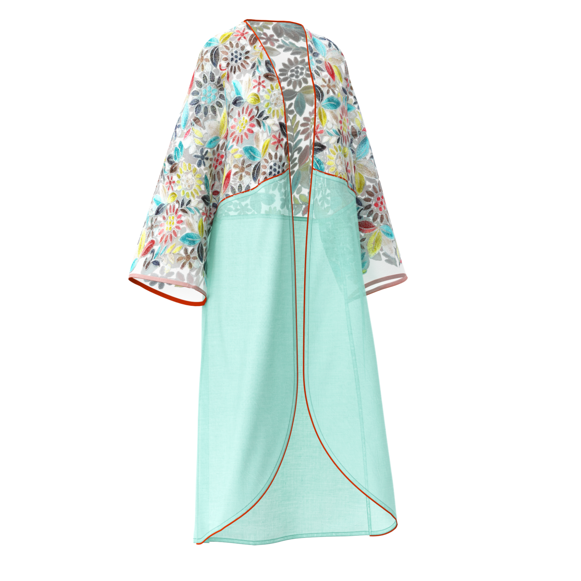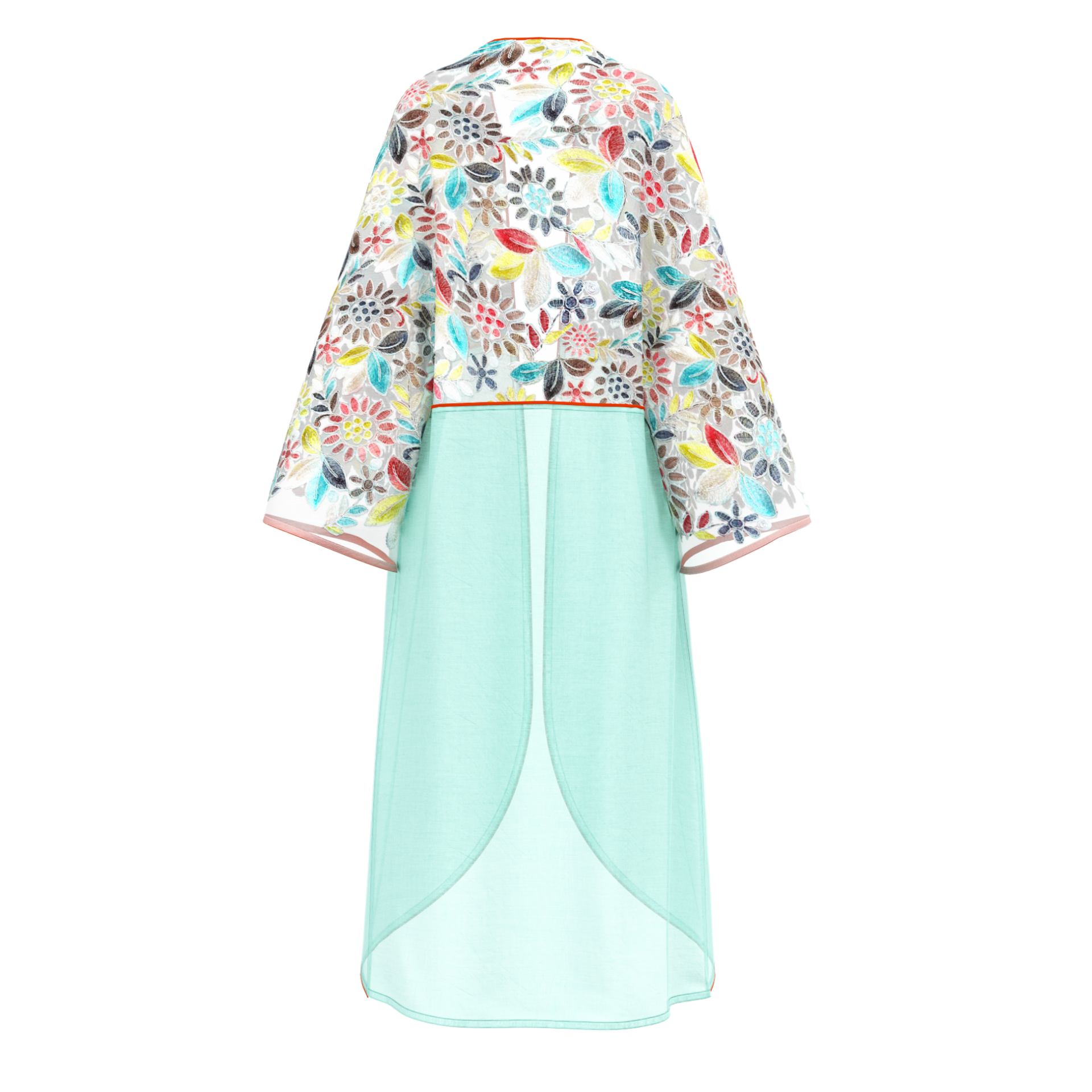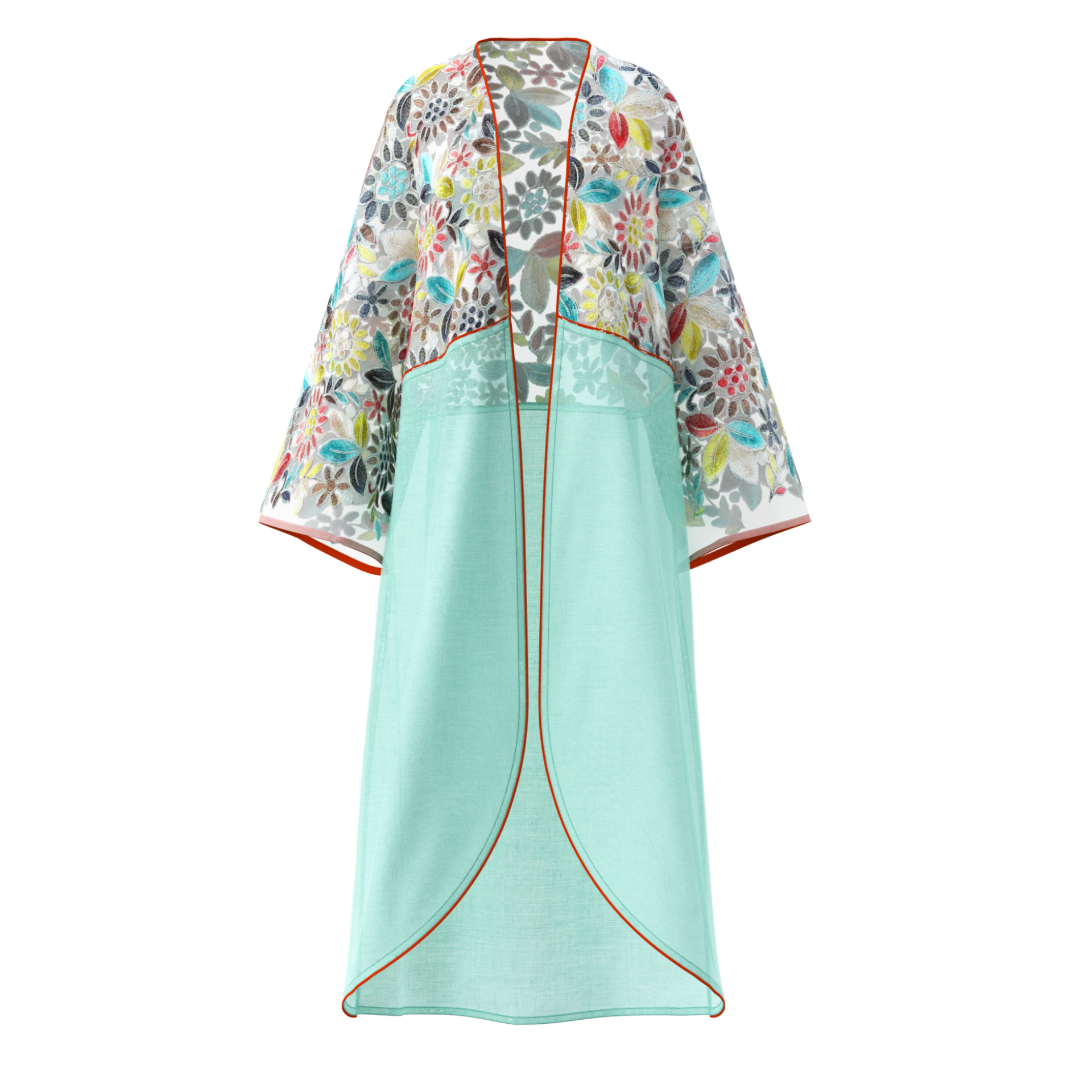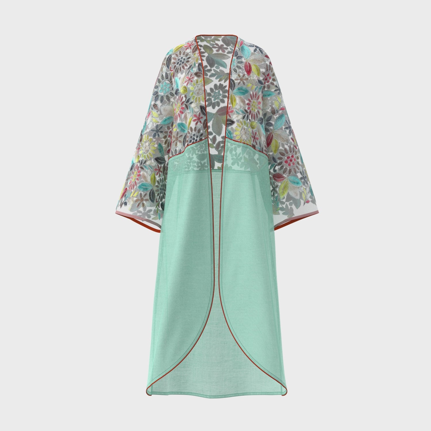 This vibrant kimono features an exquisite mix of floral embroidery on a delicate mesh, complemented by a fresh aqua l...