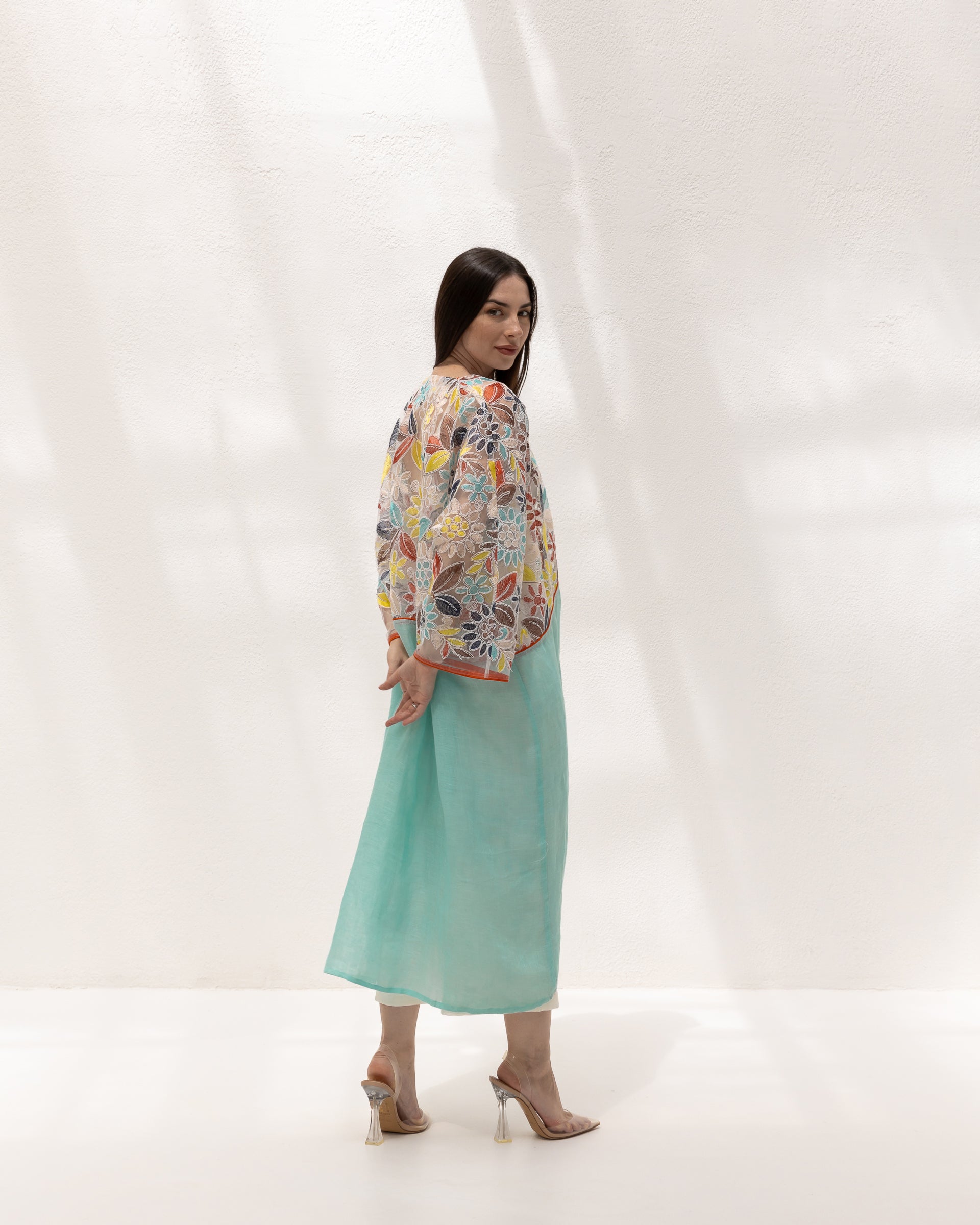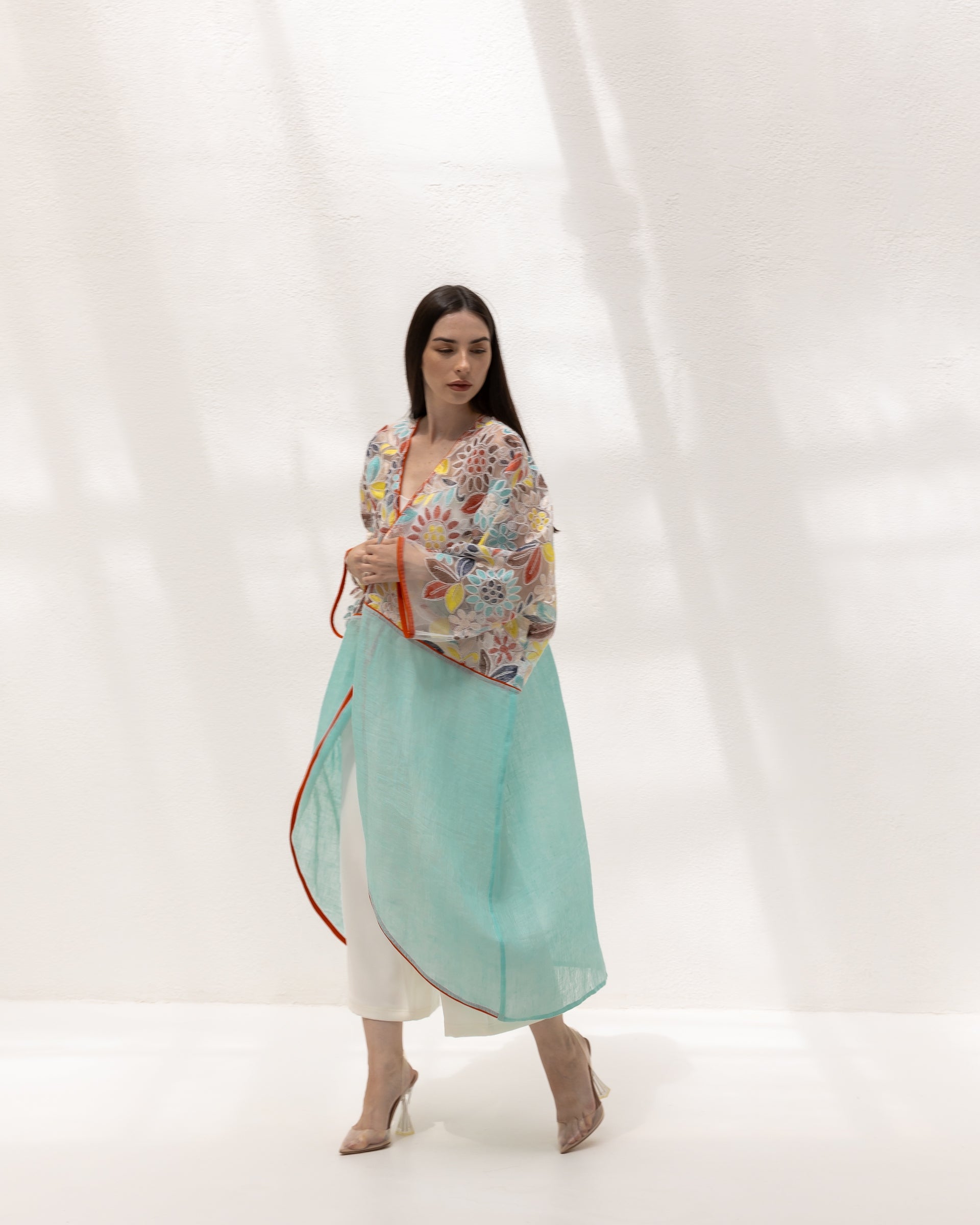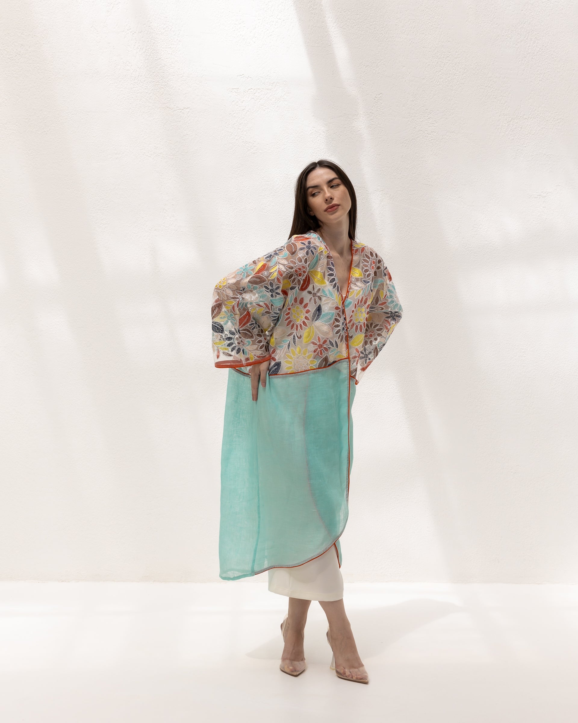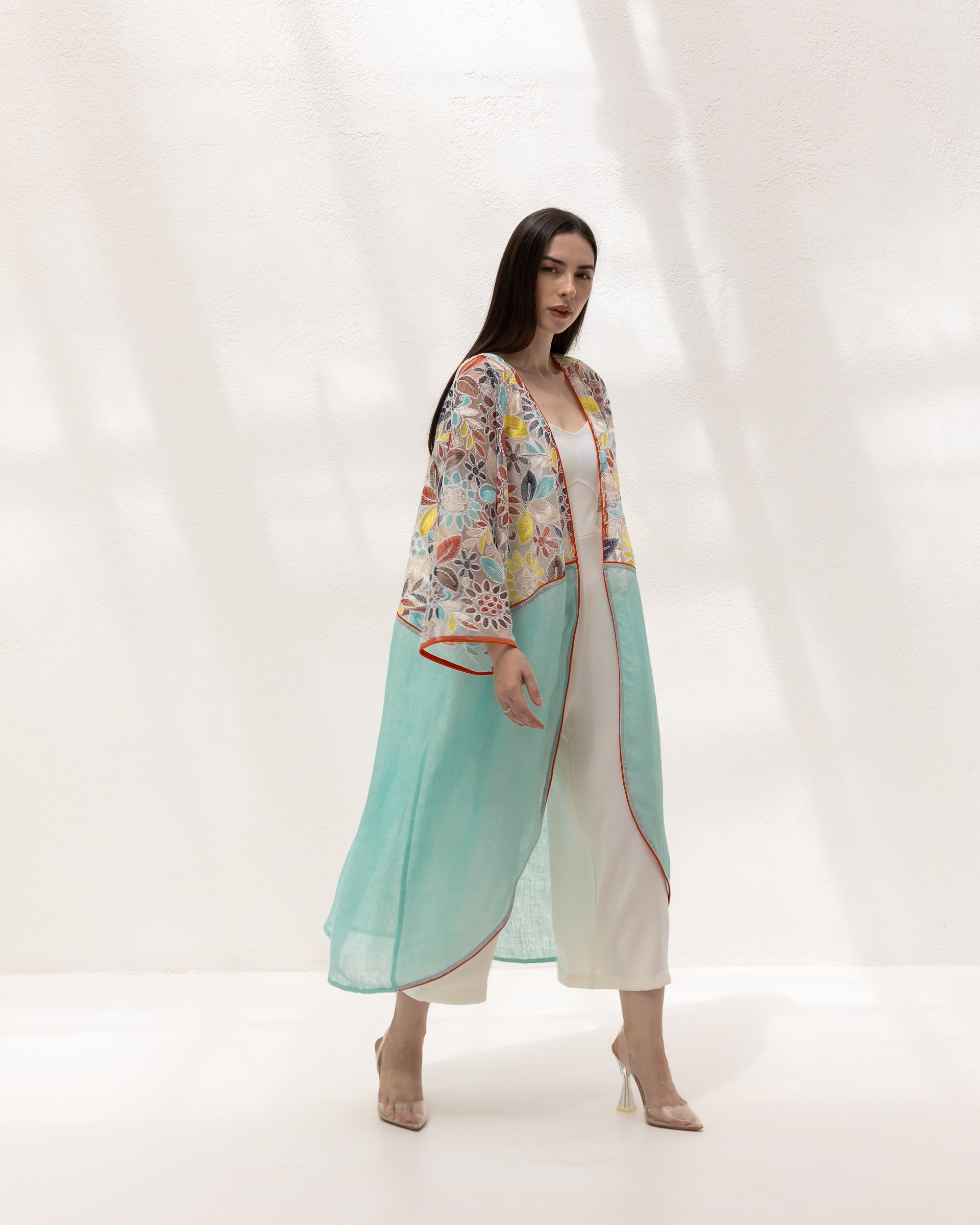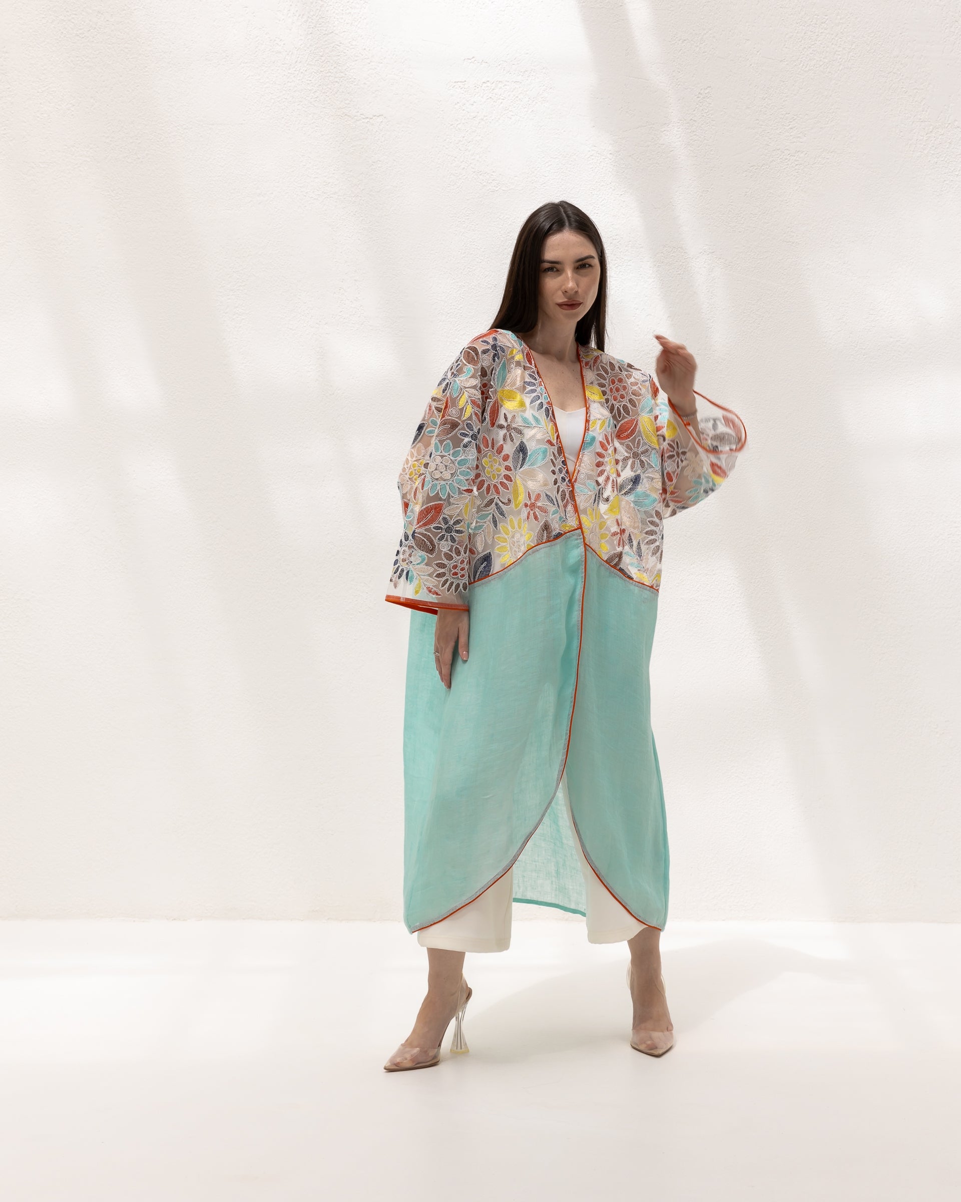 This vibrant kimono features an exquisite mix of floral embroidery on a delicate mesh, complemented by a fresh aqua l...