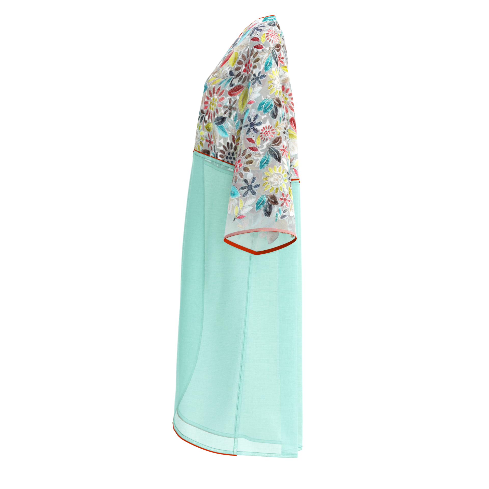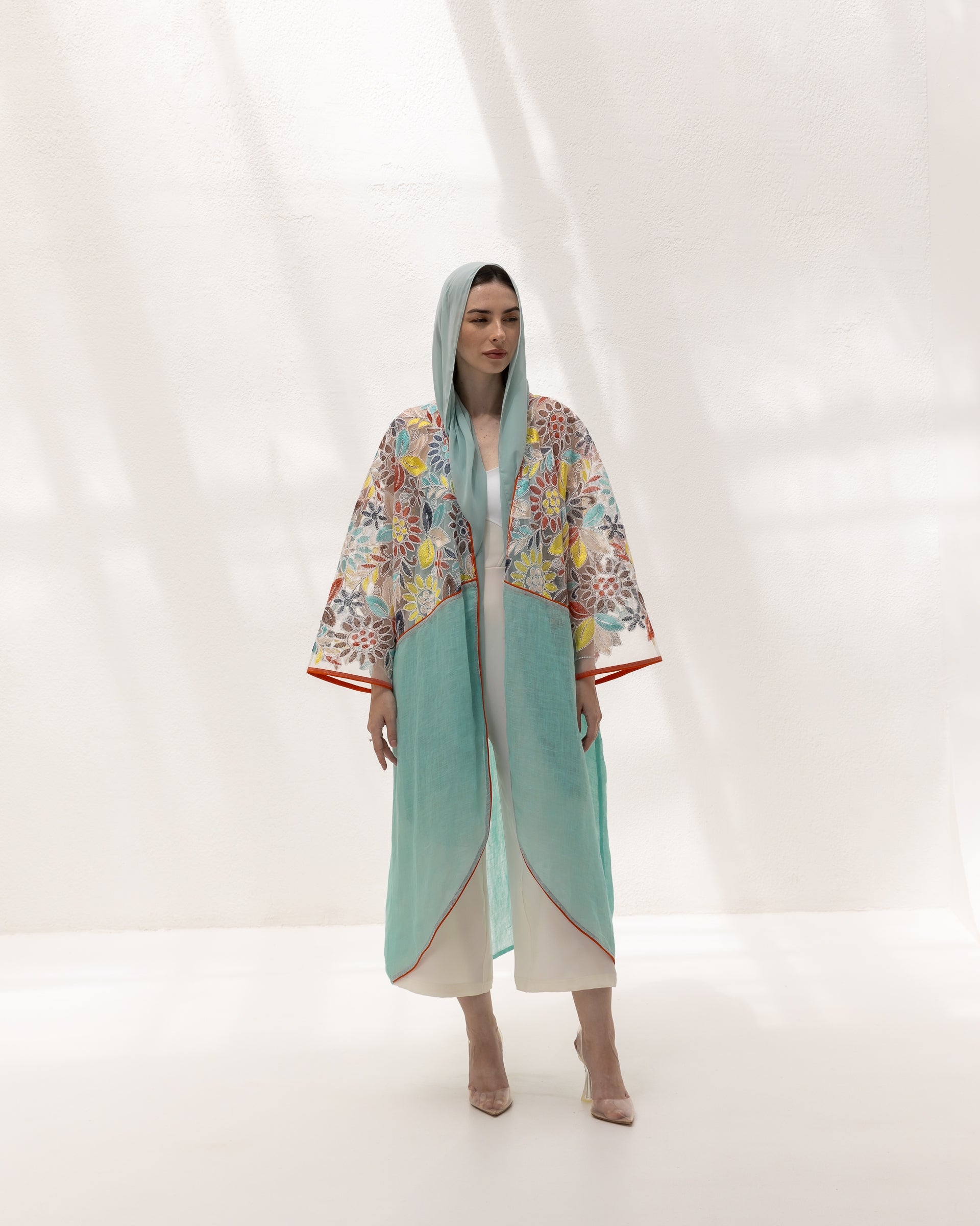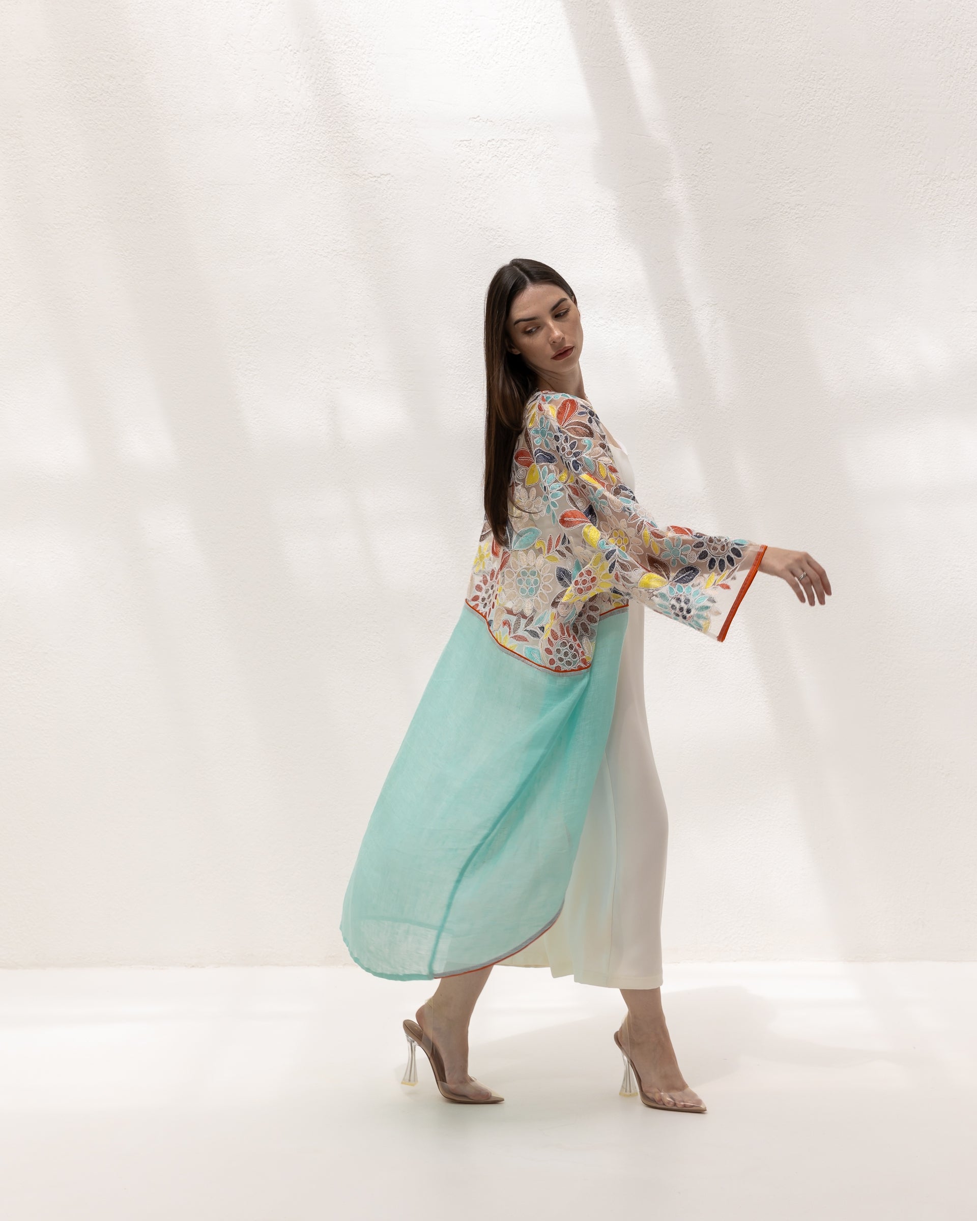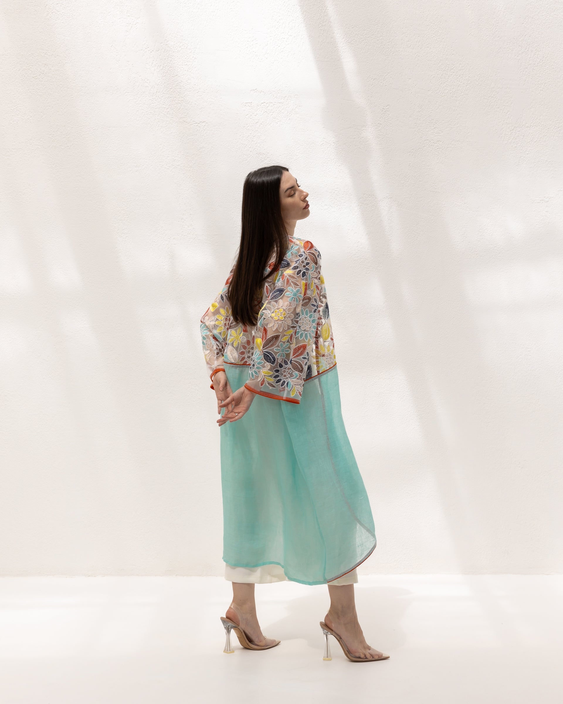 This vibrant kimono features an exquisite mix of floral embroidery on a delicate mesh, complemented by a fresh aqua l...