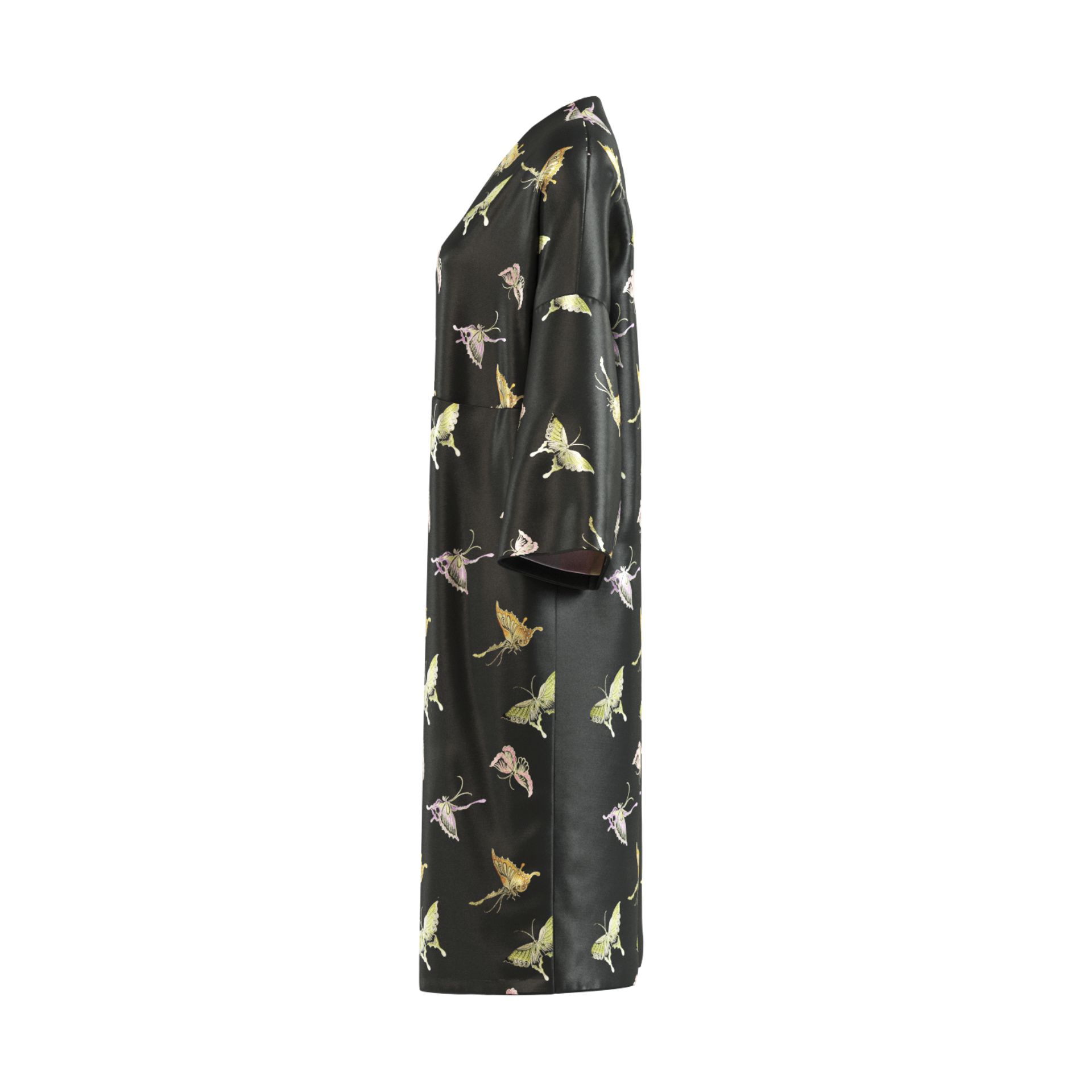 Step into a world of elegance with this exquisite black kimono, adorned with delicate butterfly motifs. Crafted from ...