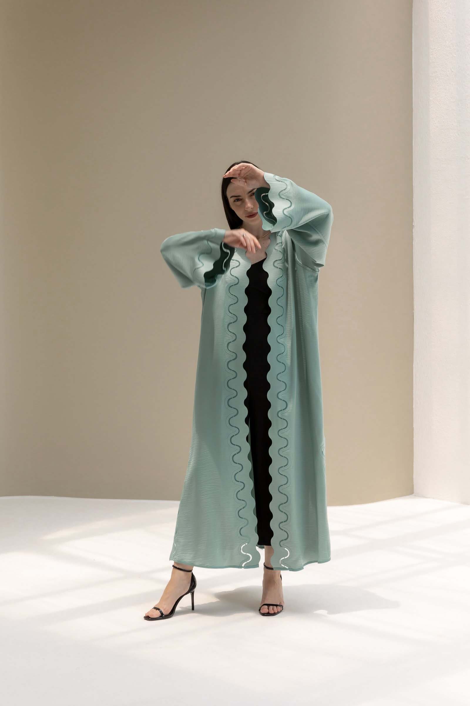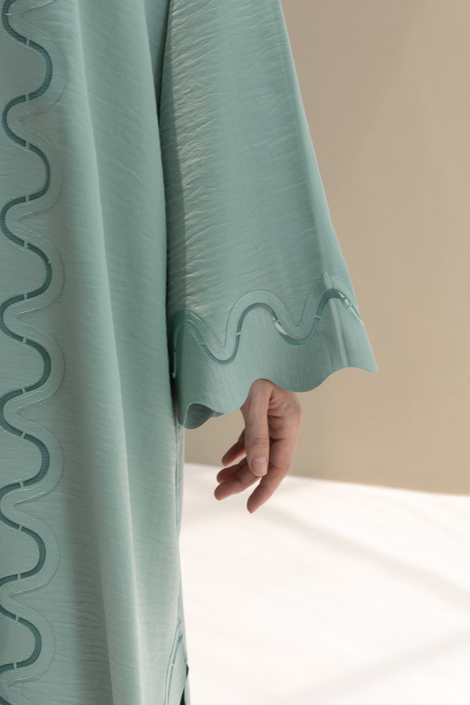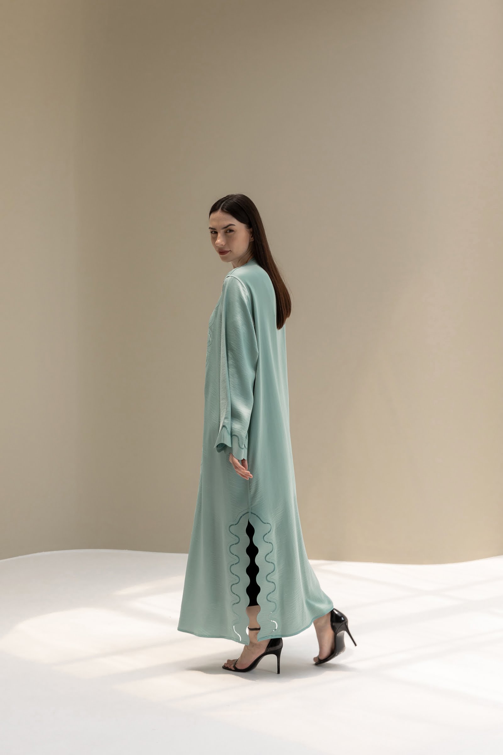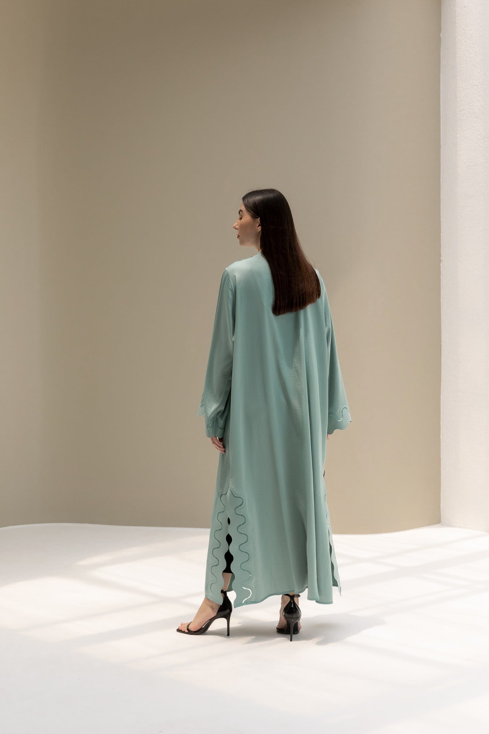 Indulge in the refreshing elegance of this sea foam green abaya, designed to elevate your wardrobe with its unique ch...