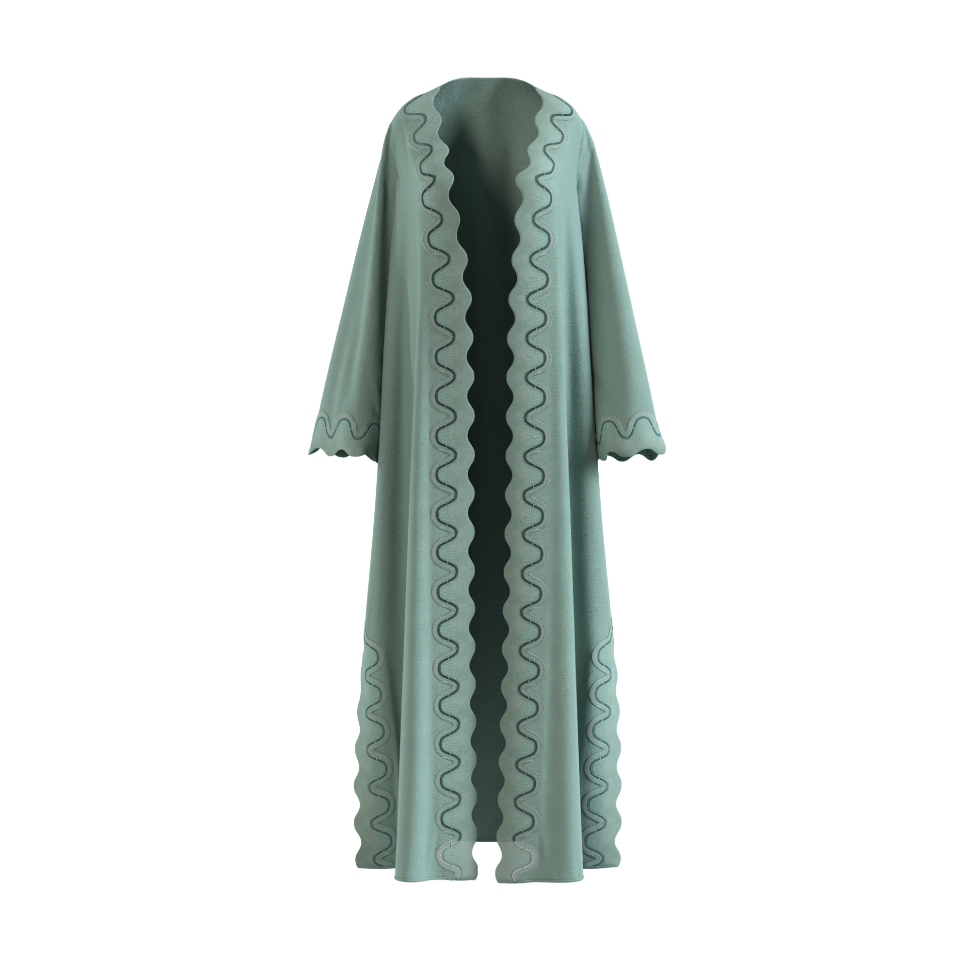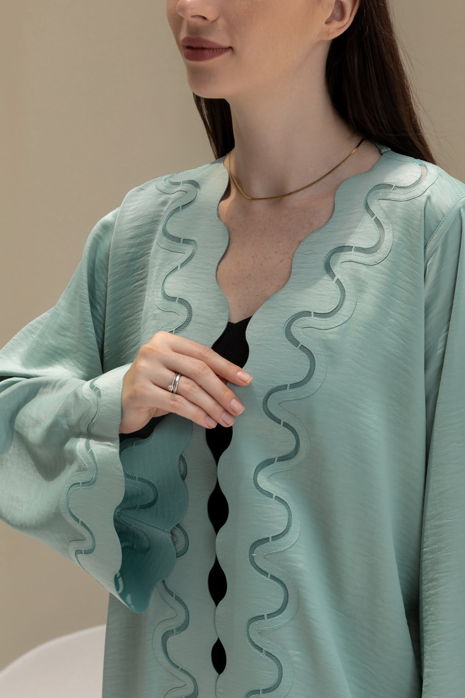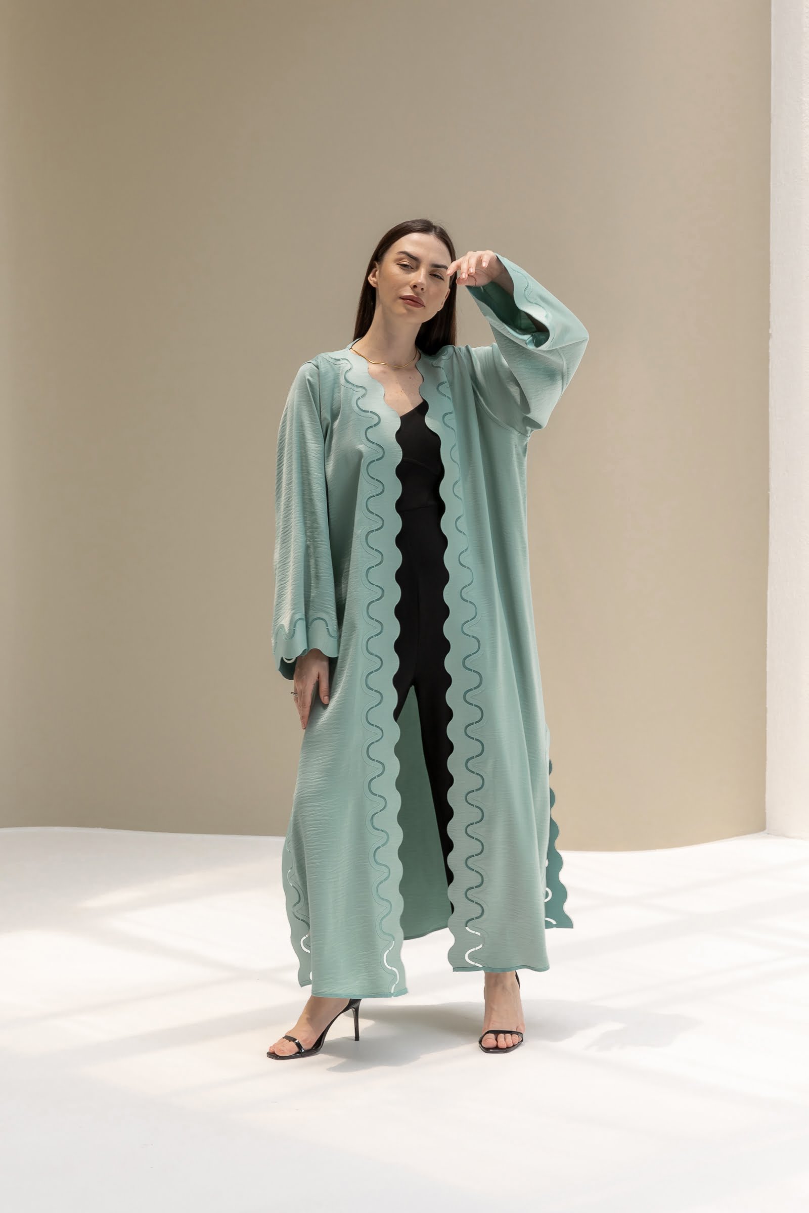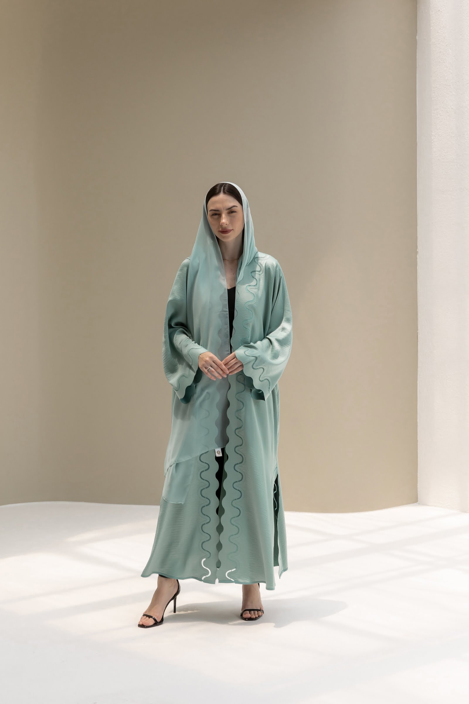 Indulge in the refreshing elegance of this sea foam green abaya, designed to elevate your wardrobe with its unique ch...