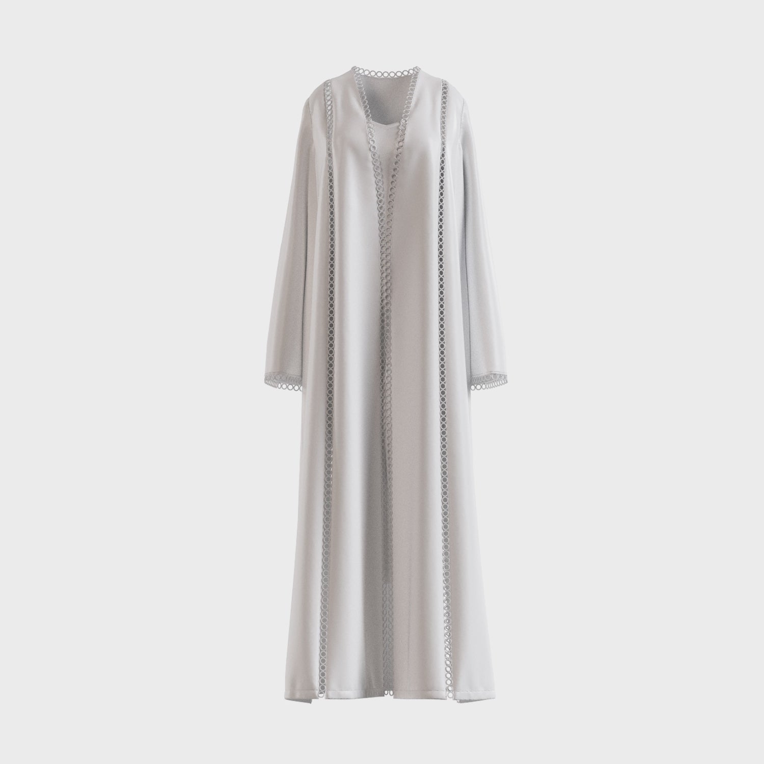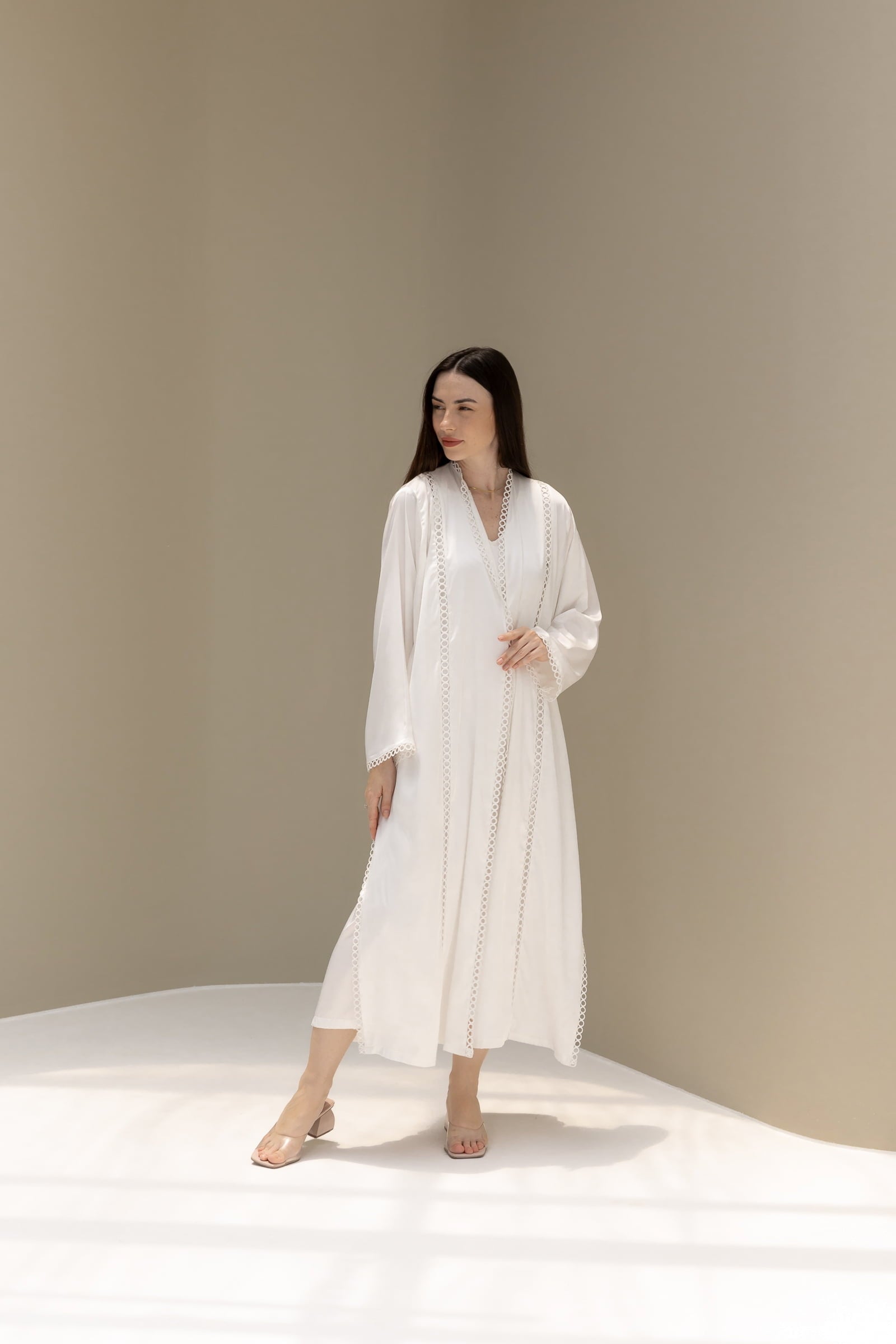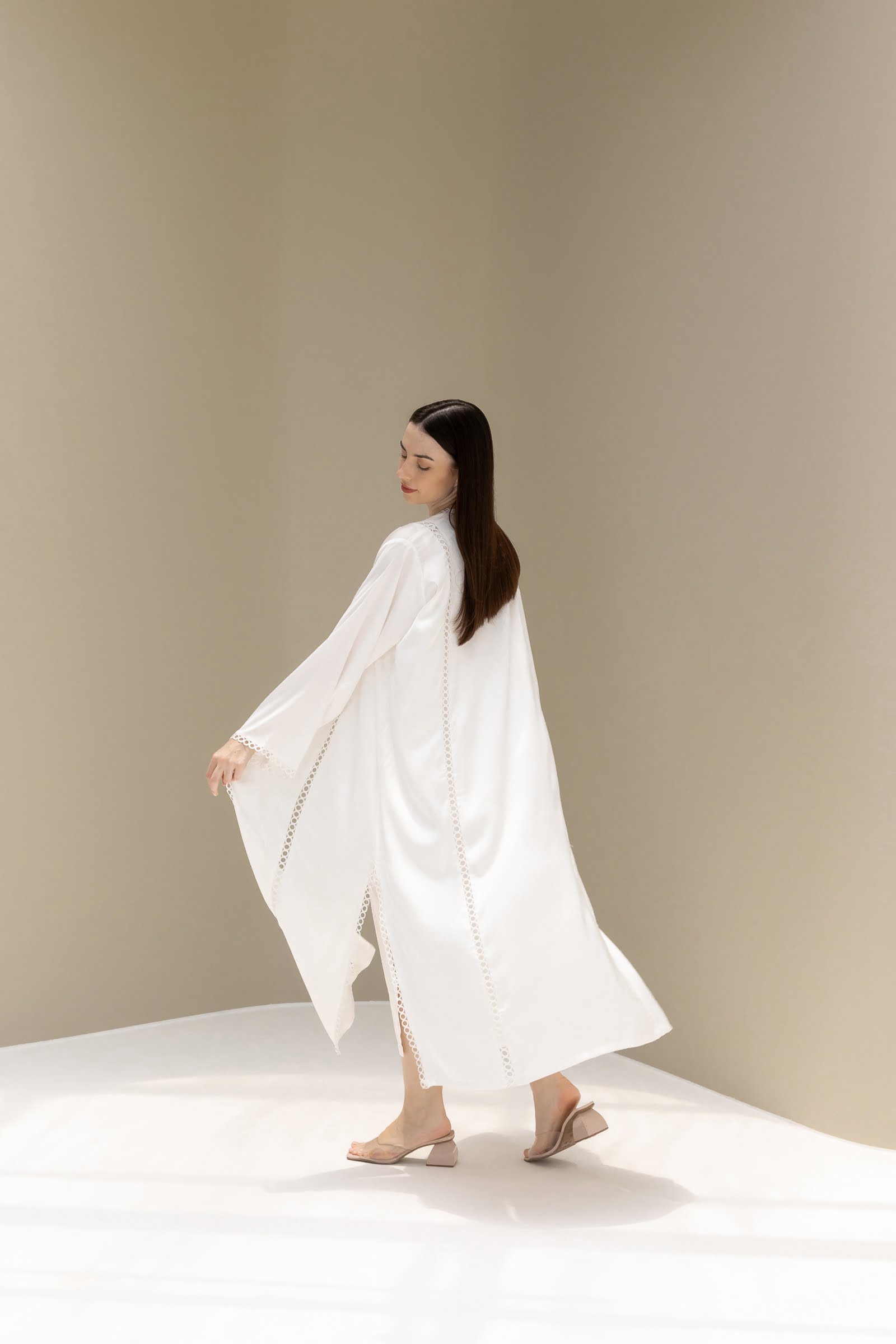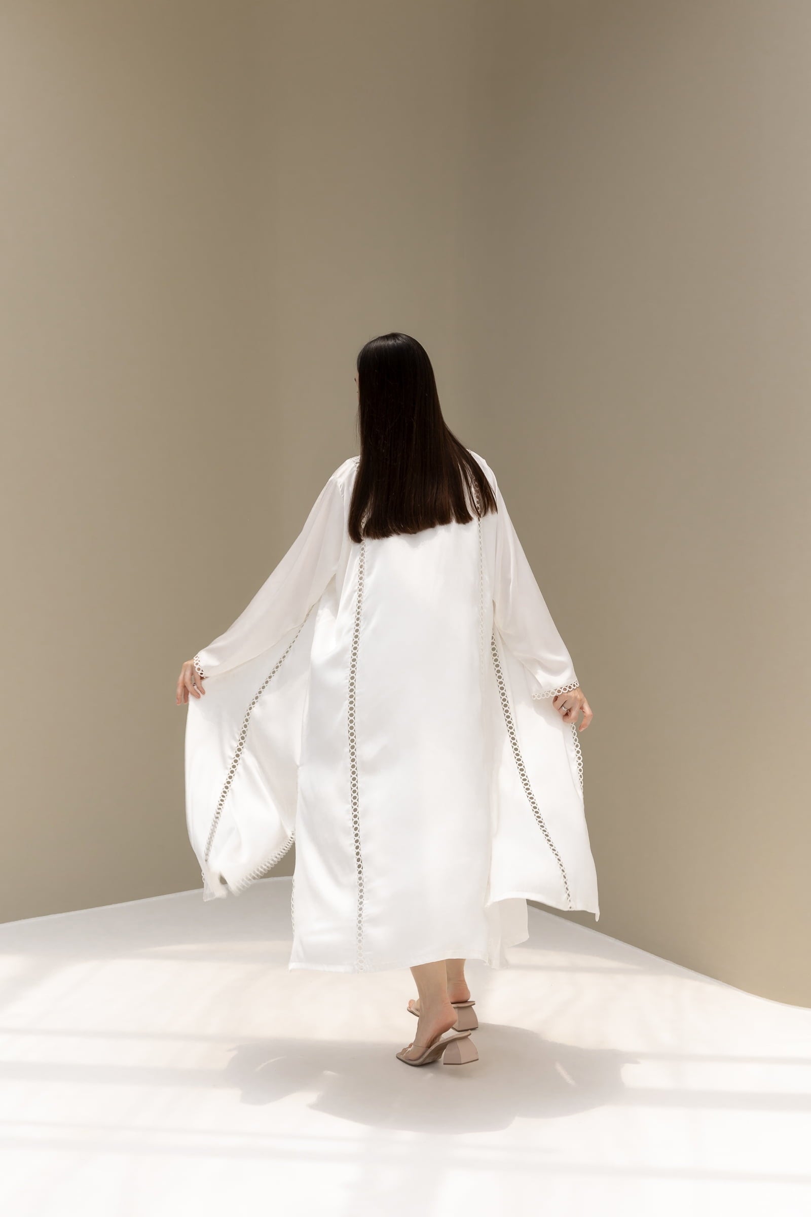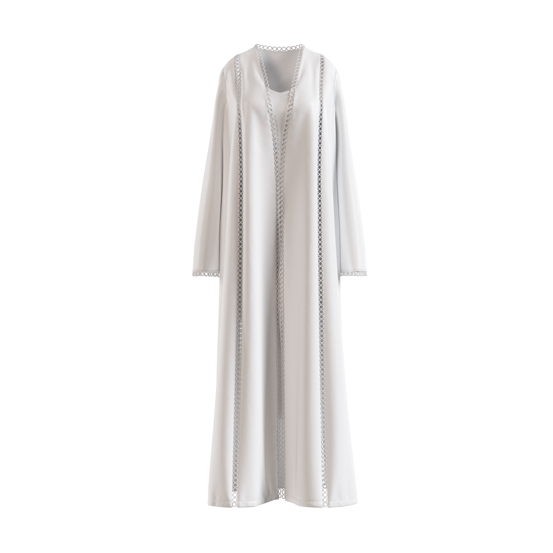 Elevate your wardrobe with this Elegant White Abaya Set, crafted from luxurious silk. The intricately scalloped trim ...
