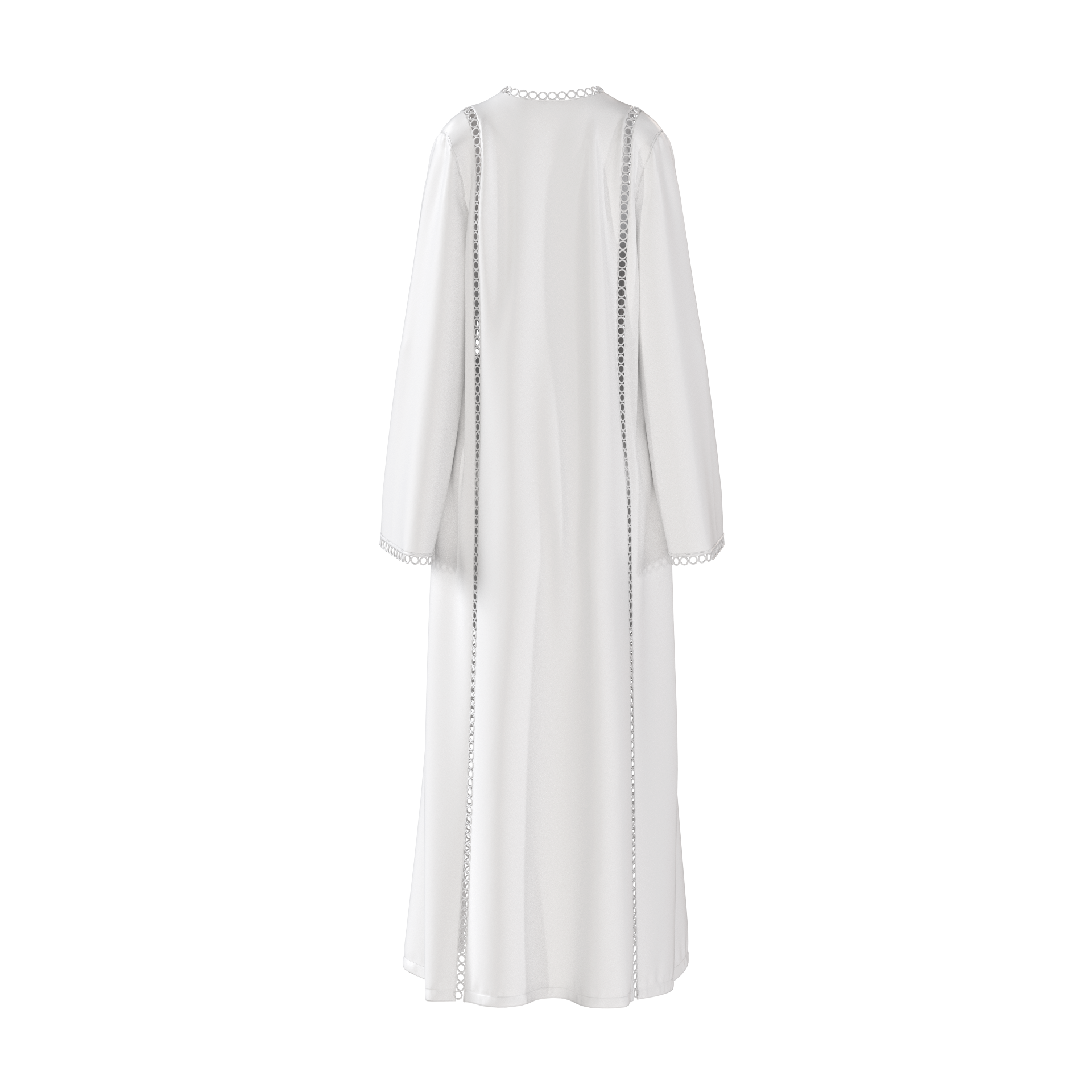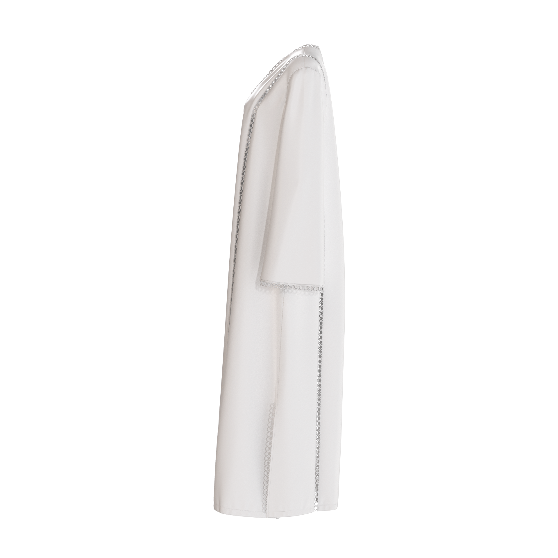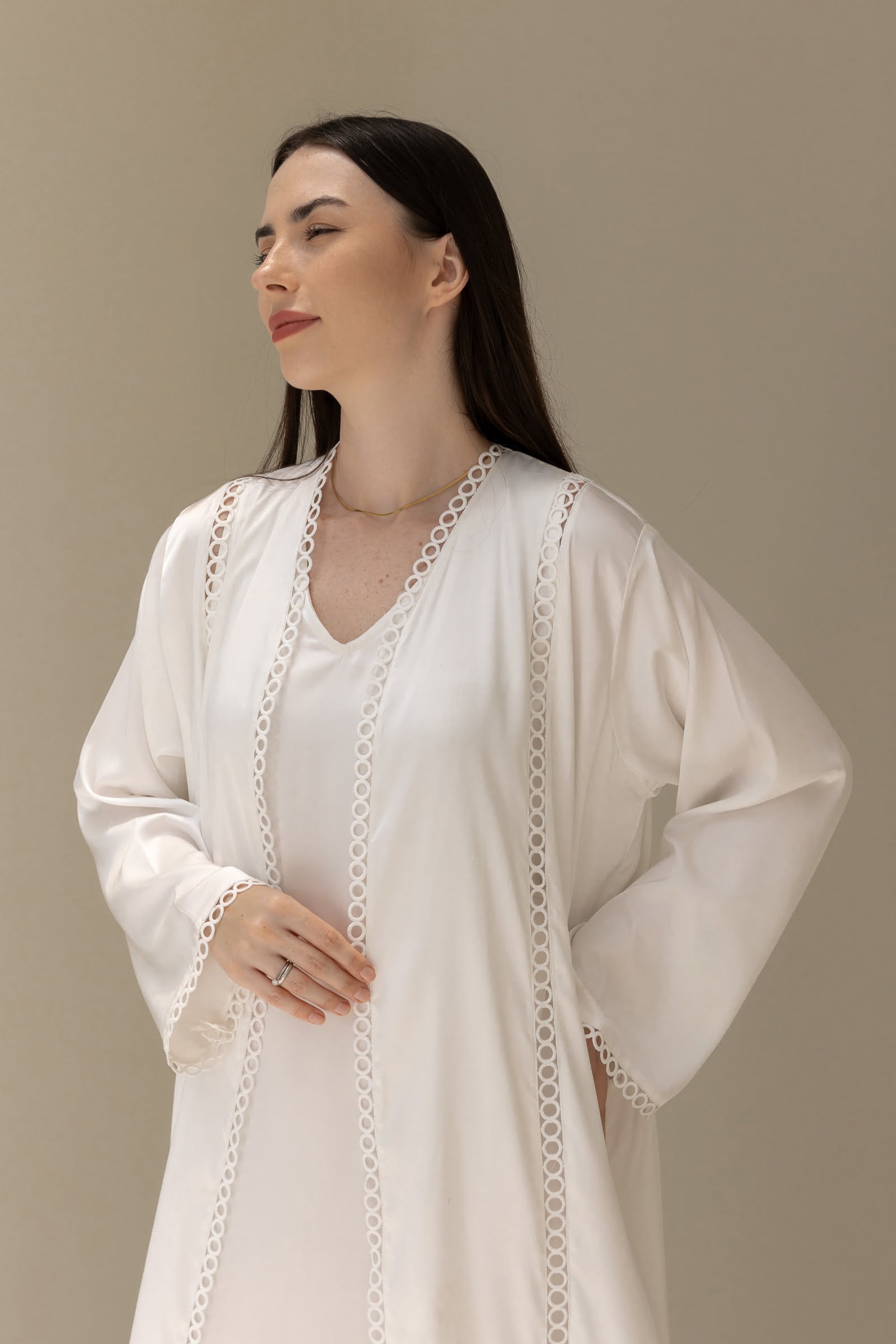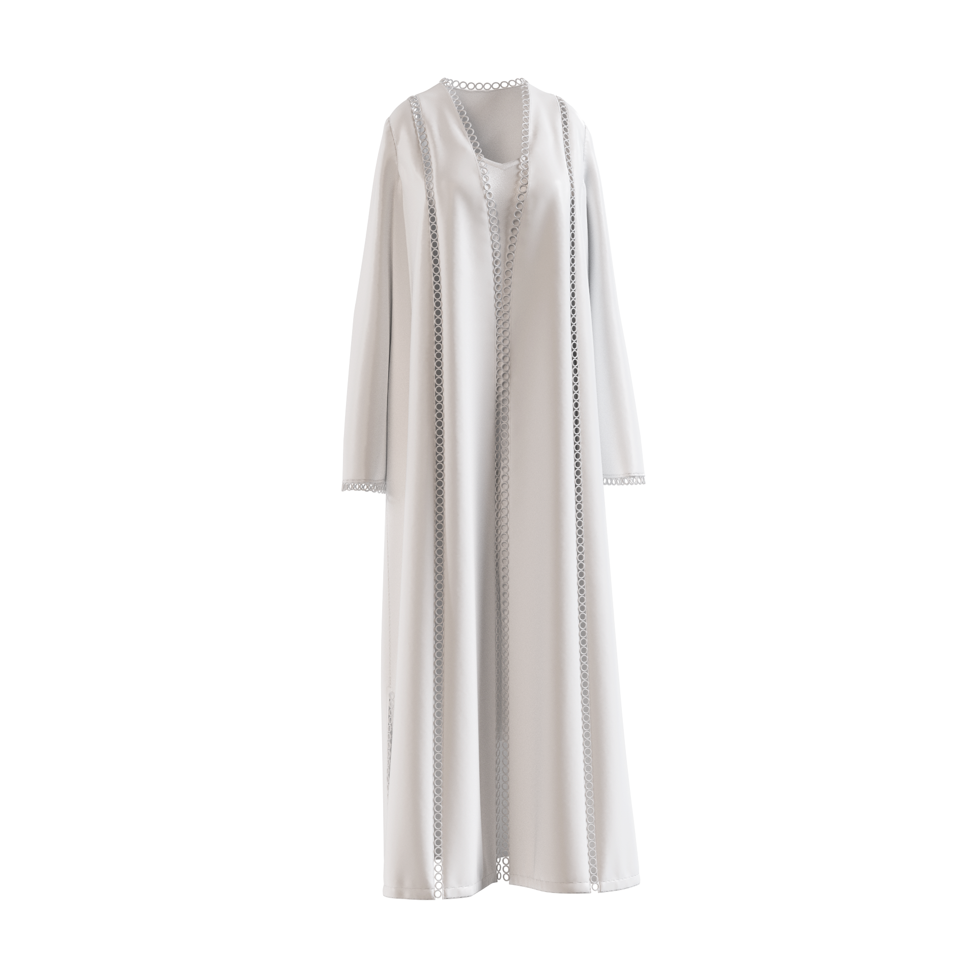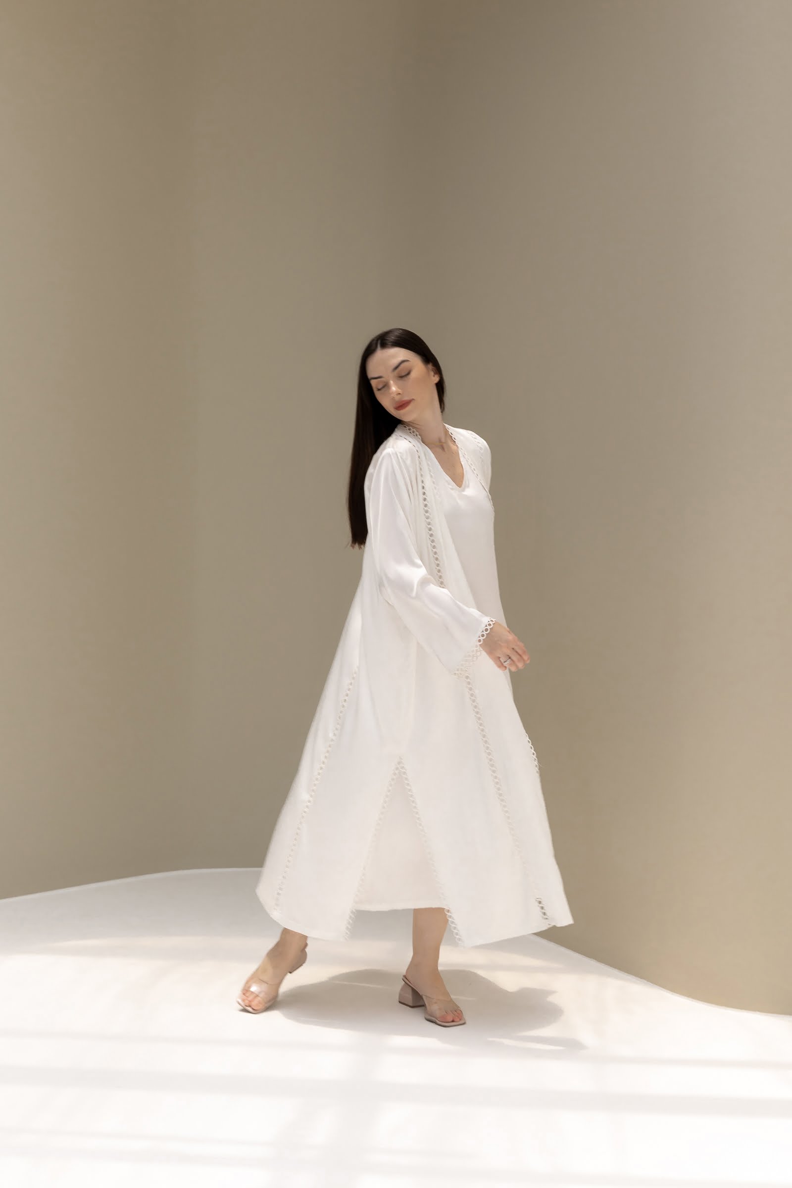 Elevate your wardrobe with this Elegant White Abaya Set, crafted from luxurious silk. The intricately scalloped trim ...