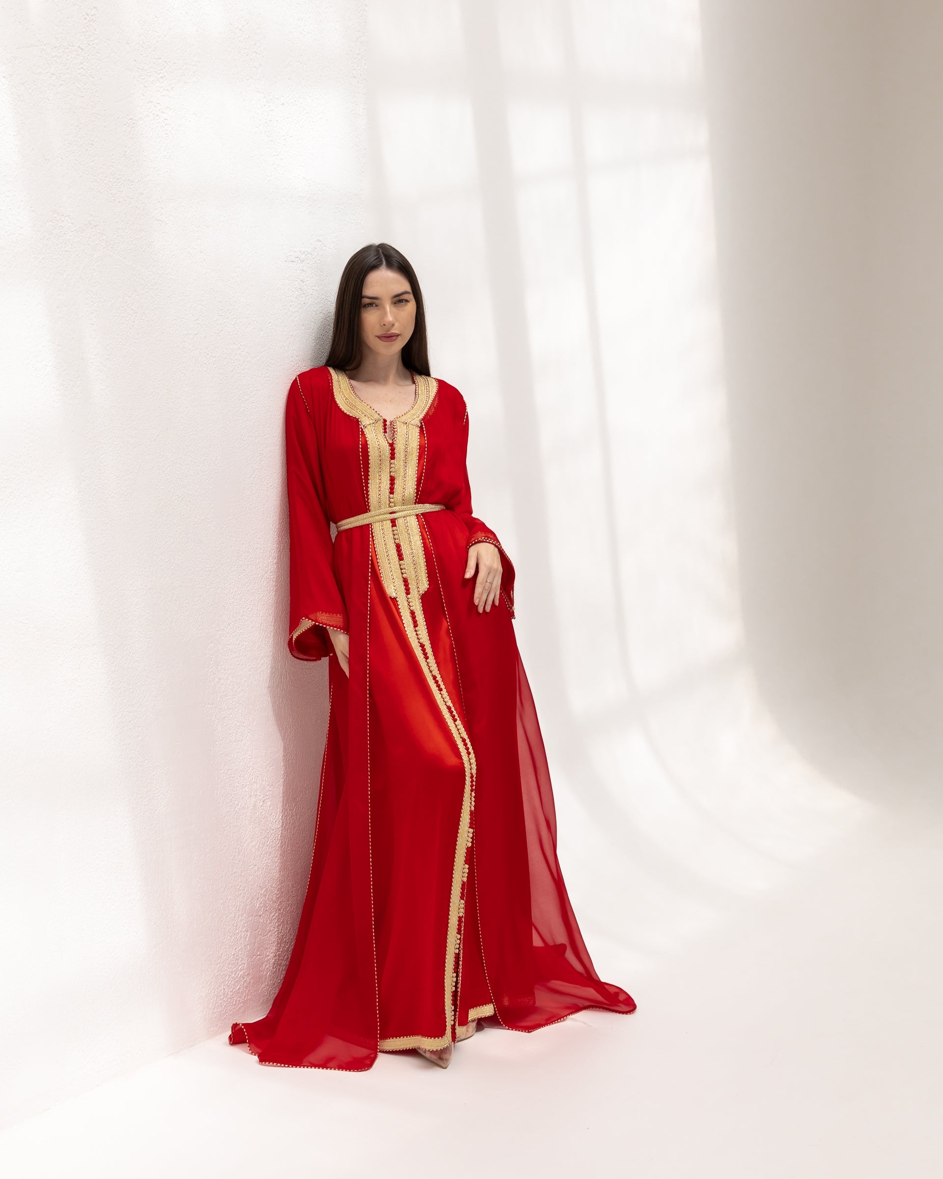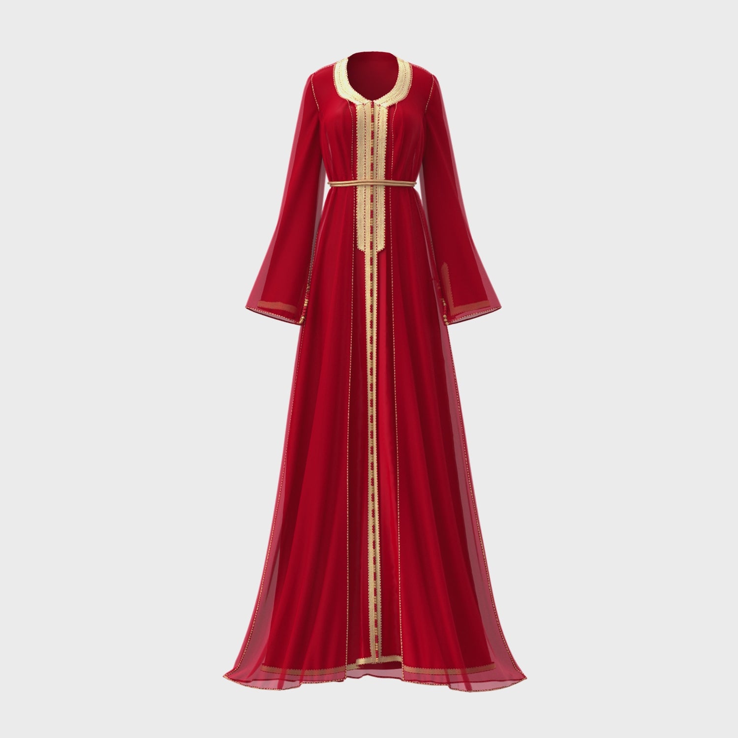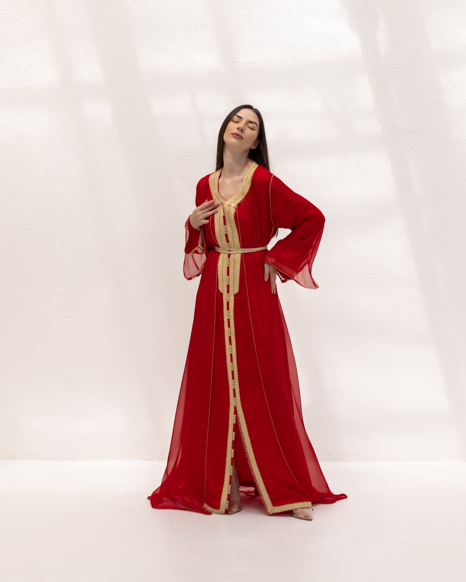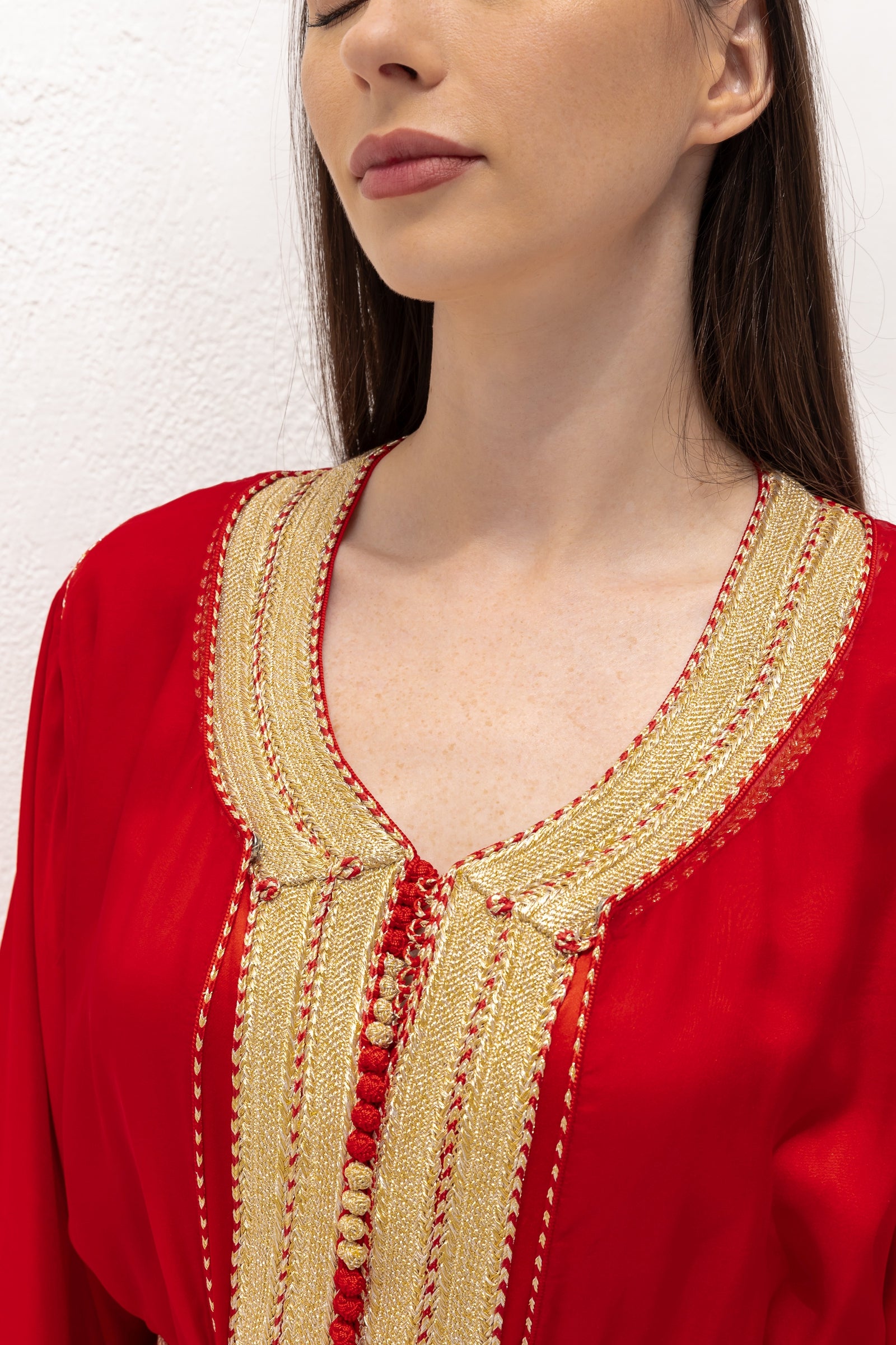 This striking piece, crafted from sumptuous fabric, captivates with its bold red hue and exquisite gold detailing. Th...