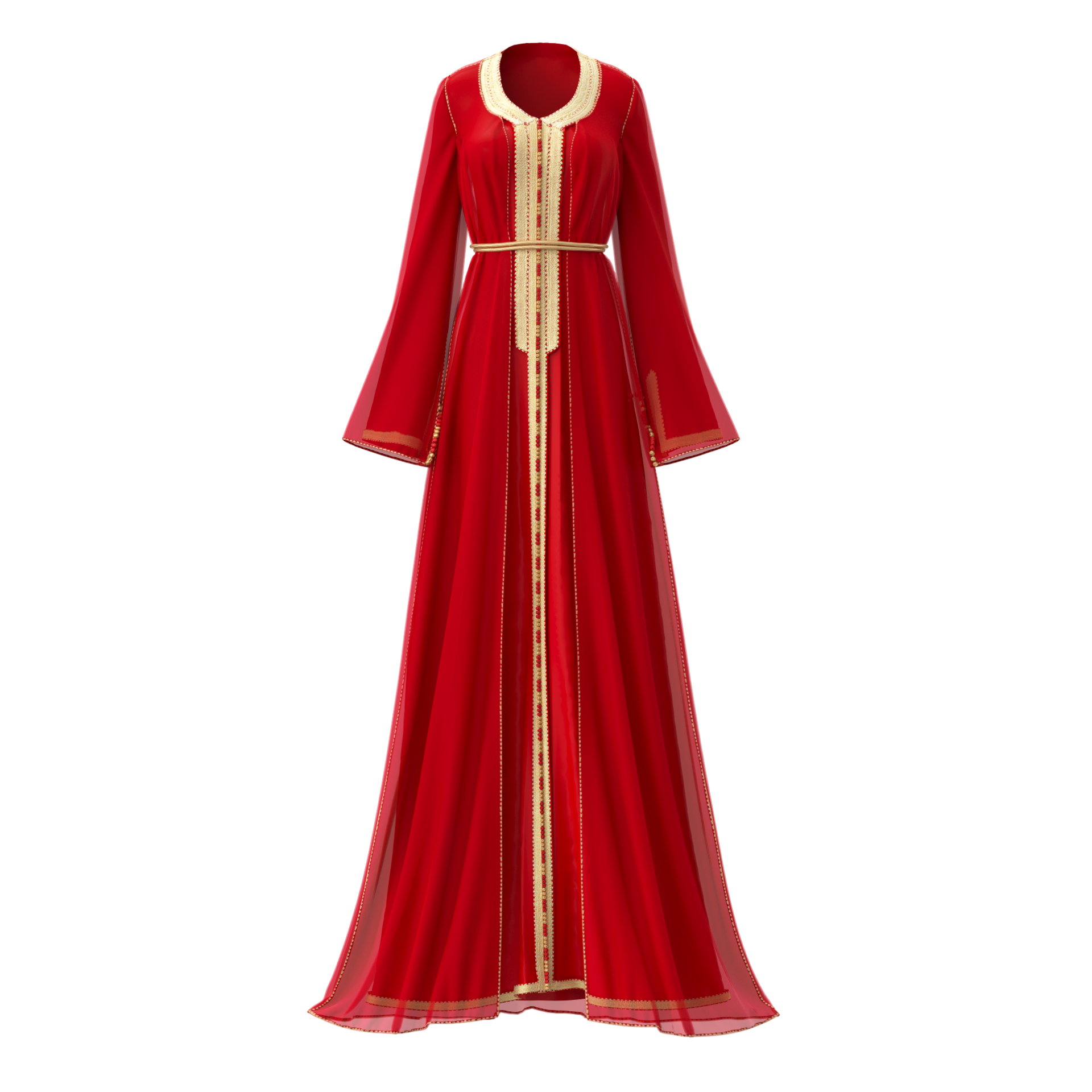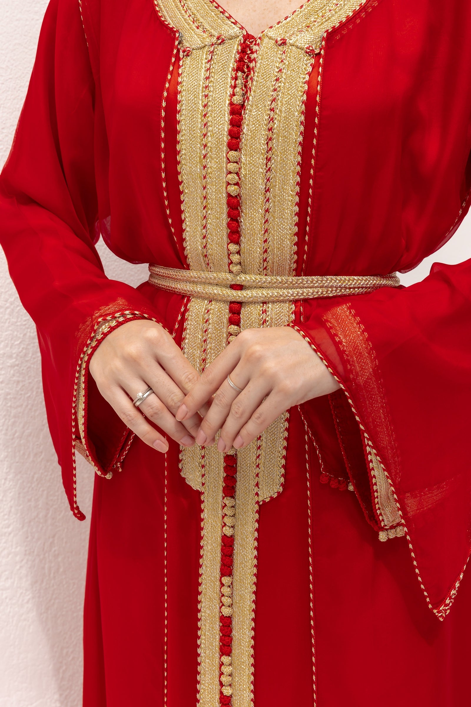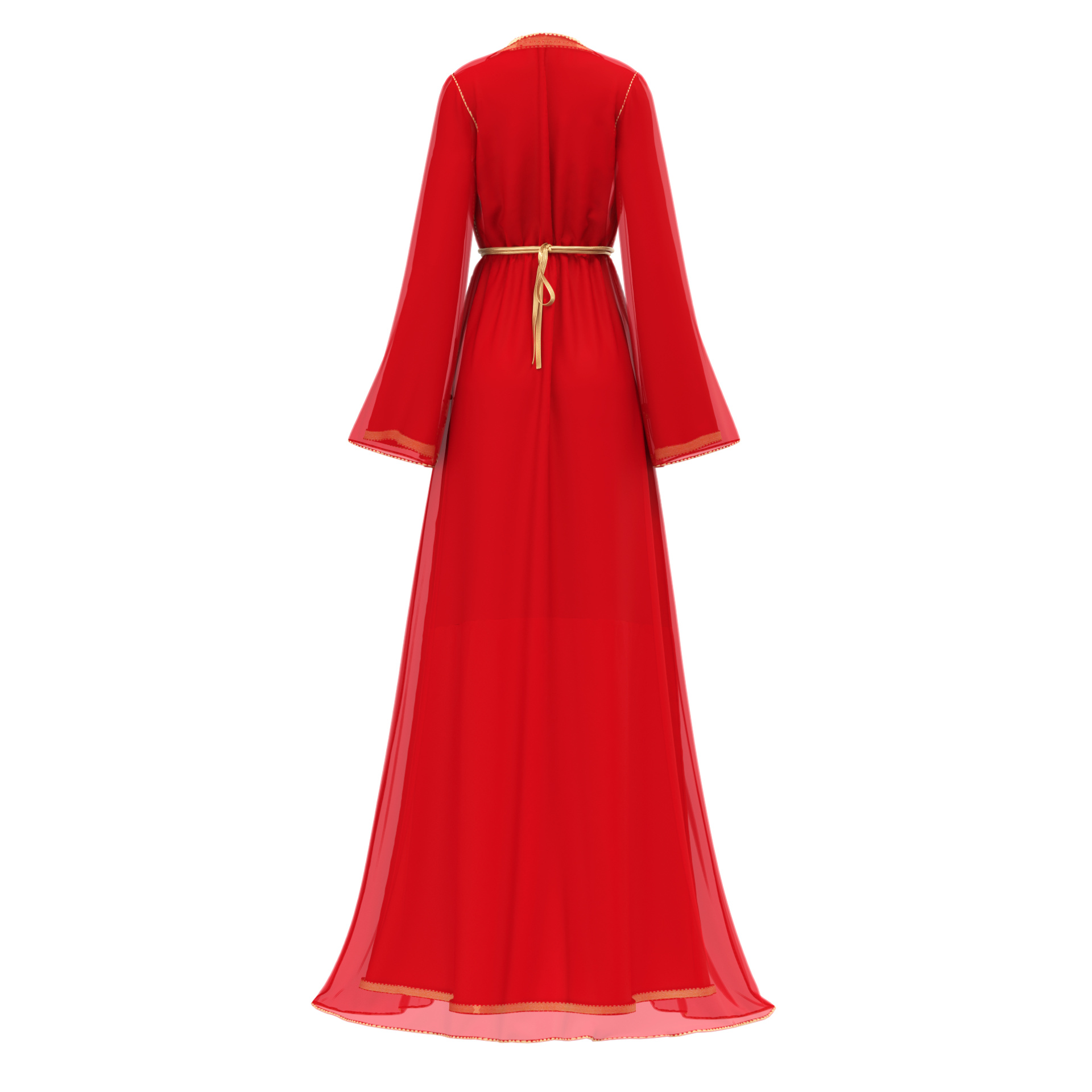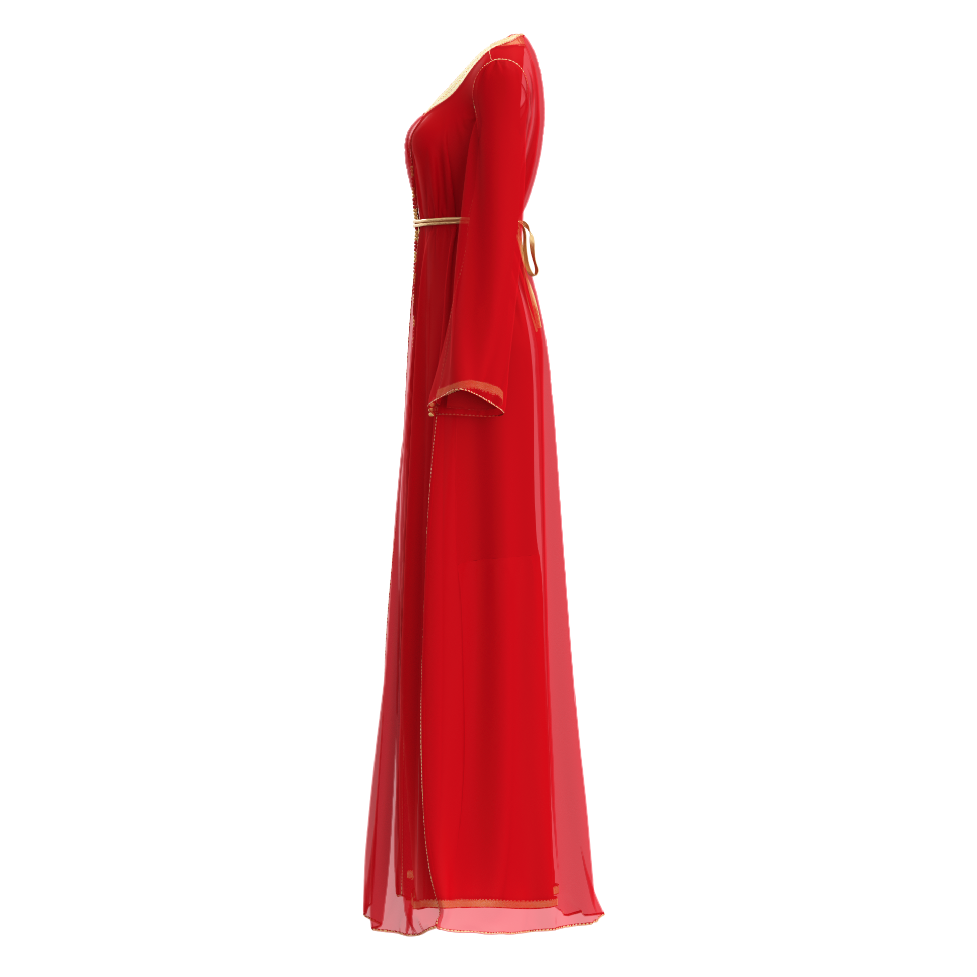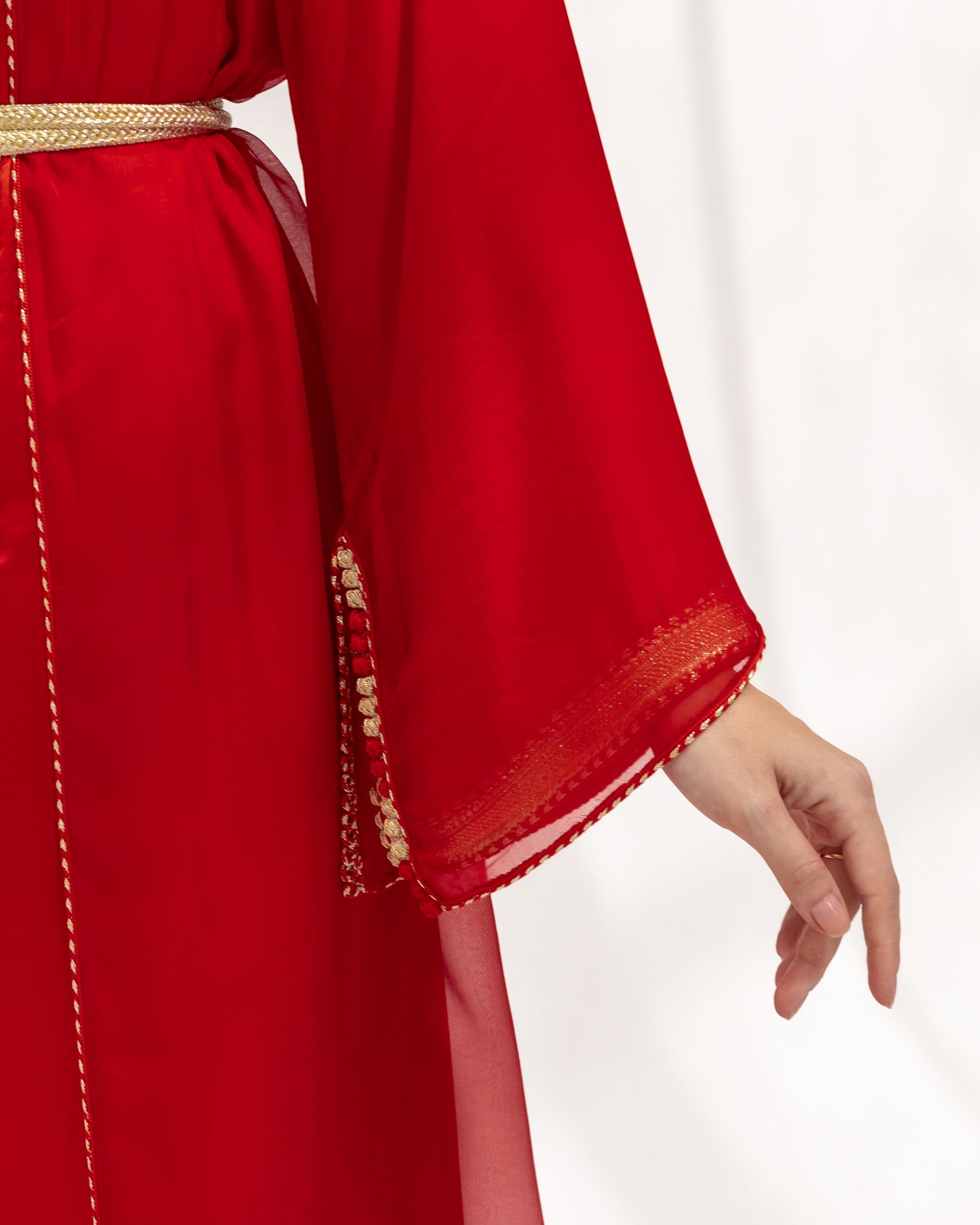This striking piece, crafted from sumptuous fabric, captivates with its bold red hue and exquisite gold detailing. Th...