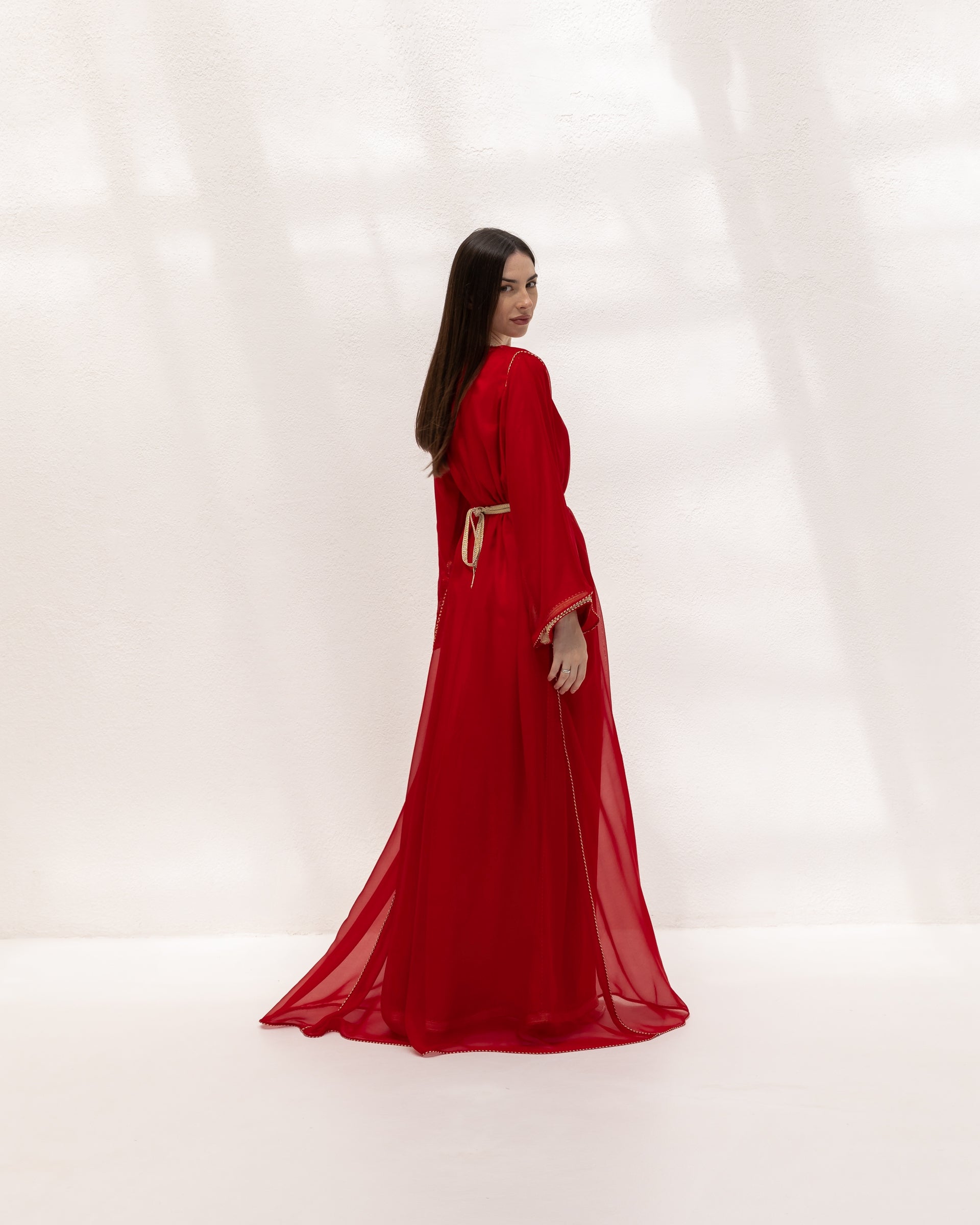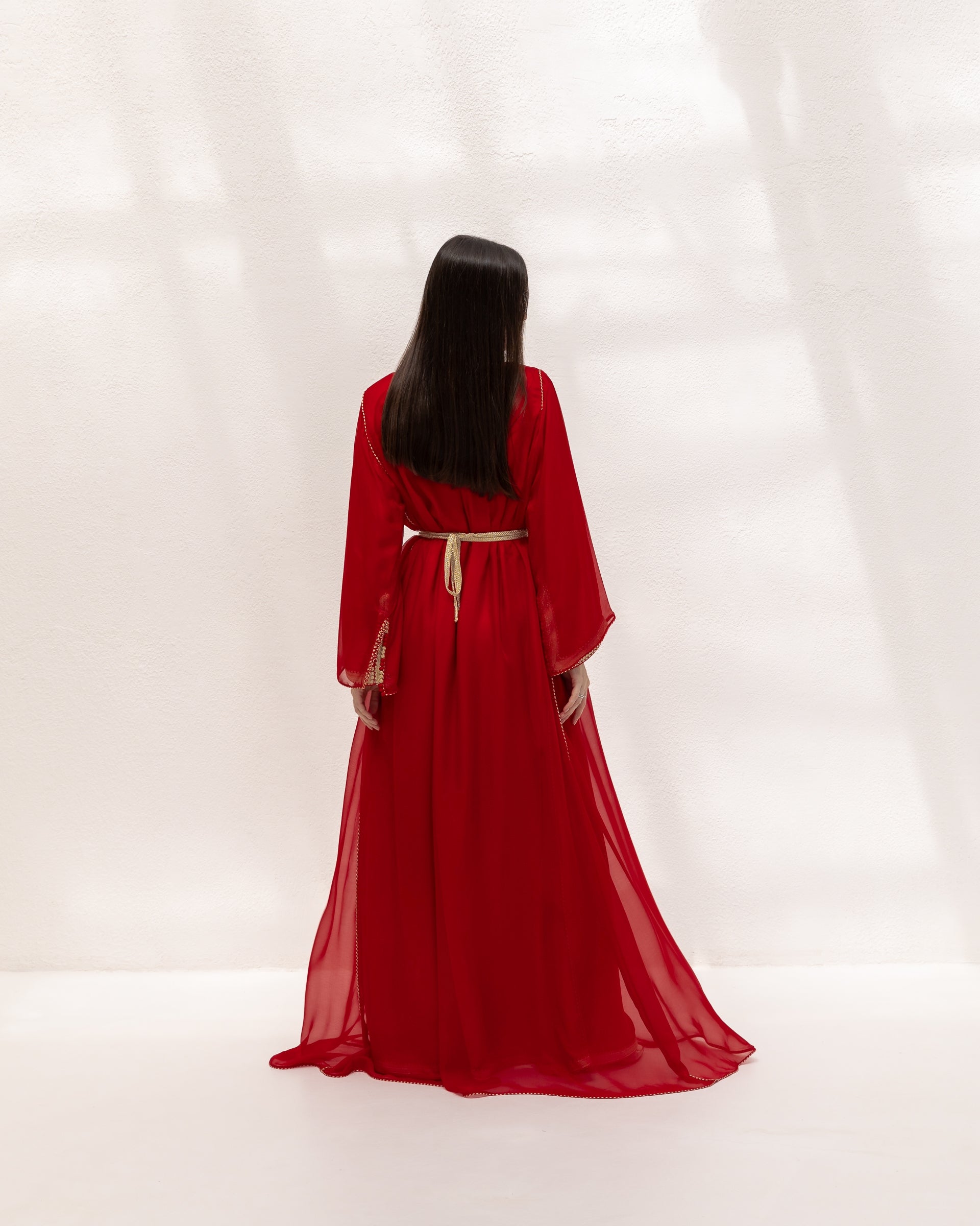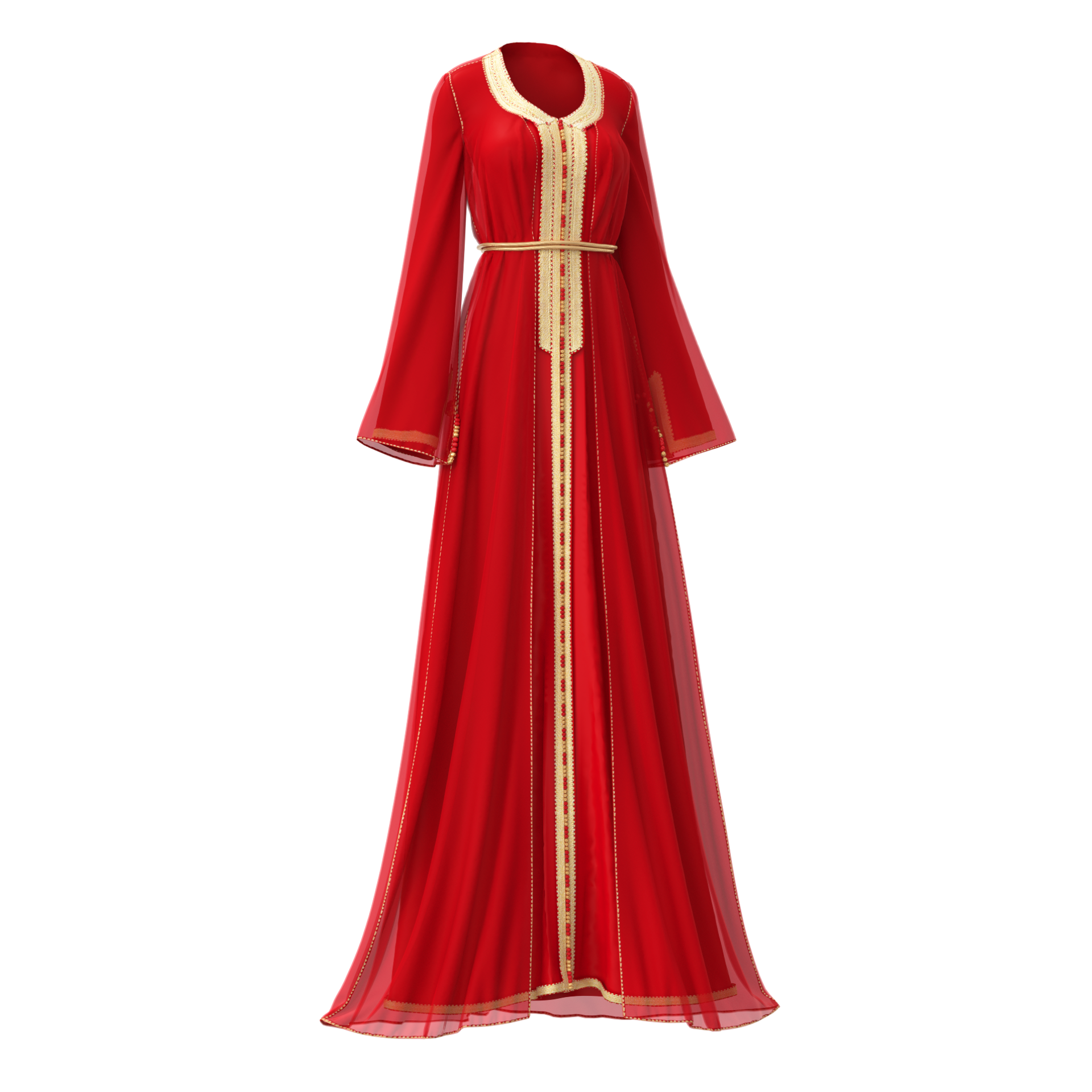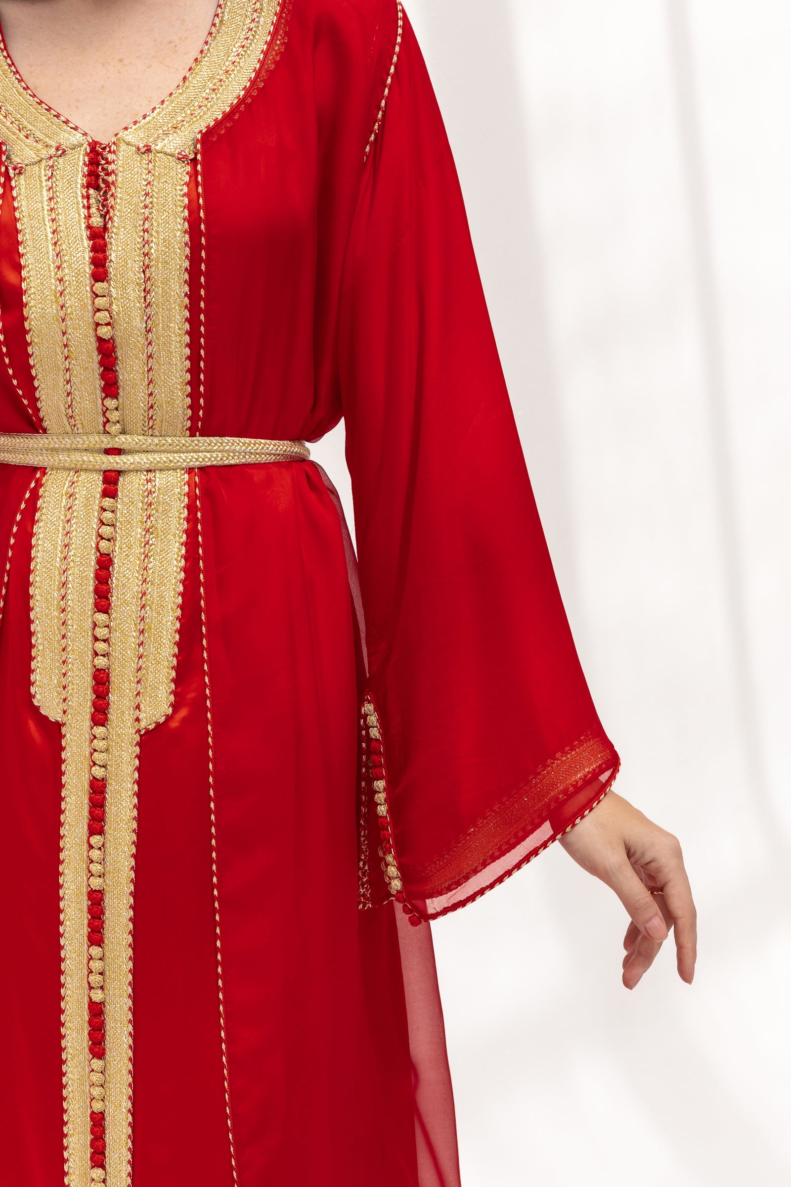 This striking piece, crafted from sumptuous fabric, captivates with its bold red hue and exquisite gold detailing. Th...