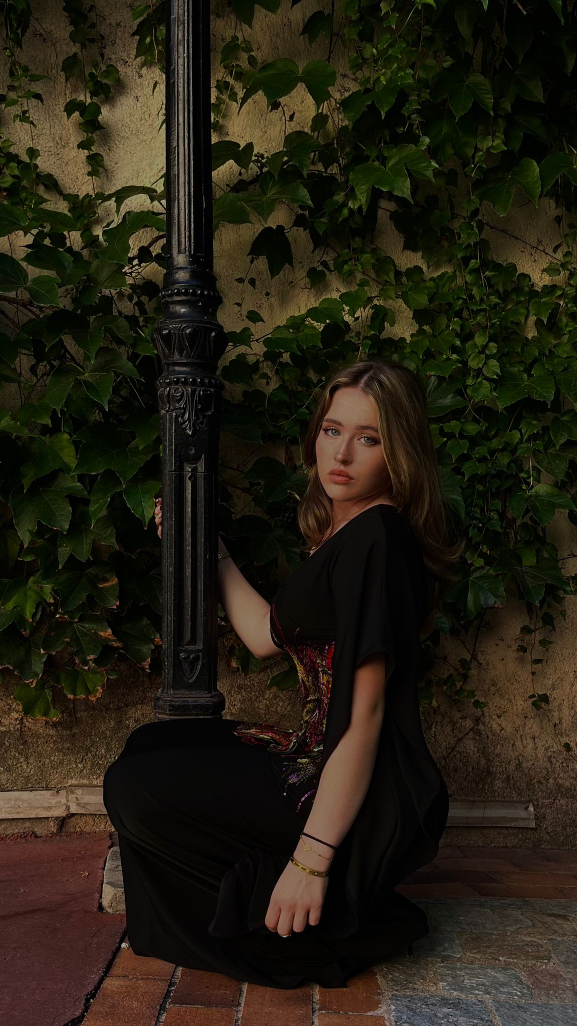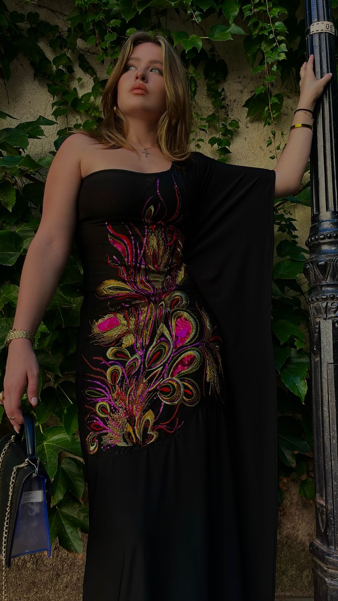 Crafted in sleek black stretch fabric that contours the body, it’s elevated by a cascade of vivid embroidery — a fusi...