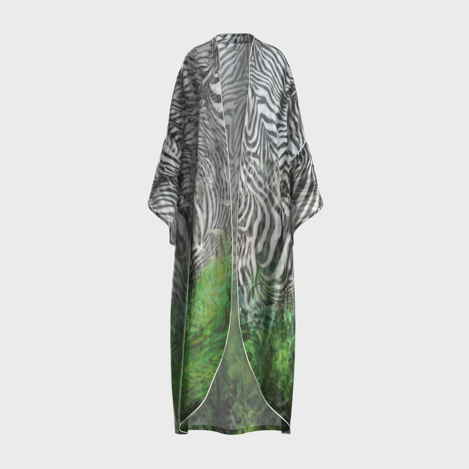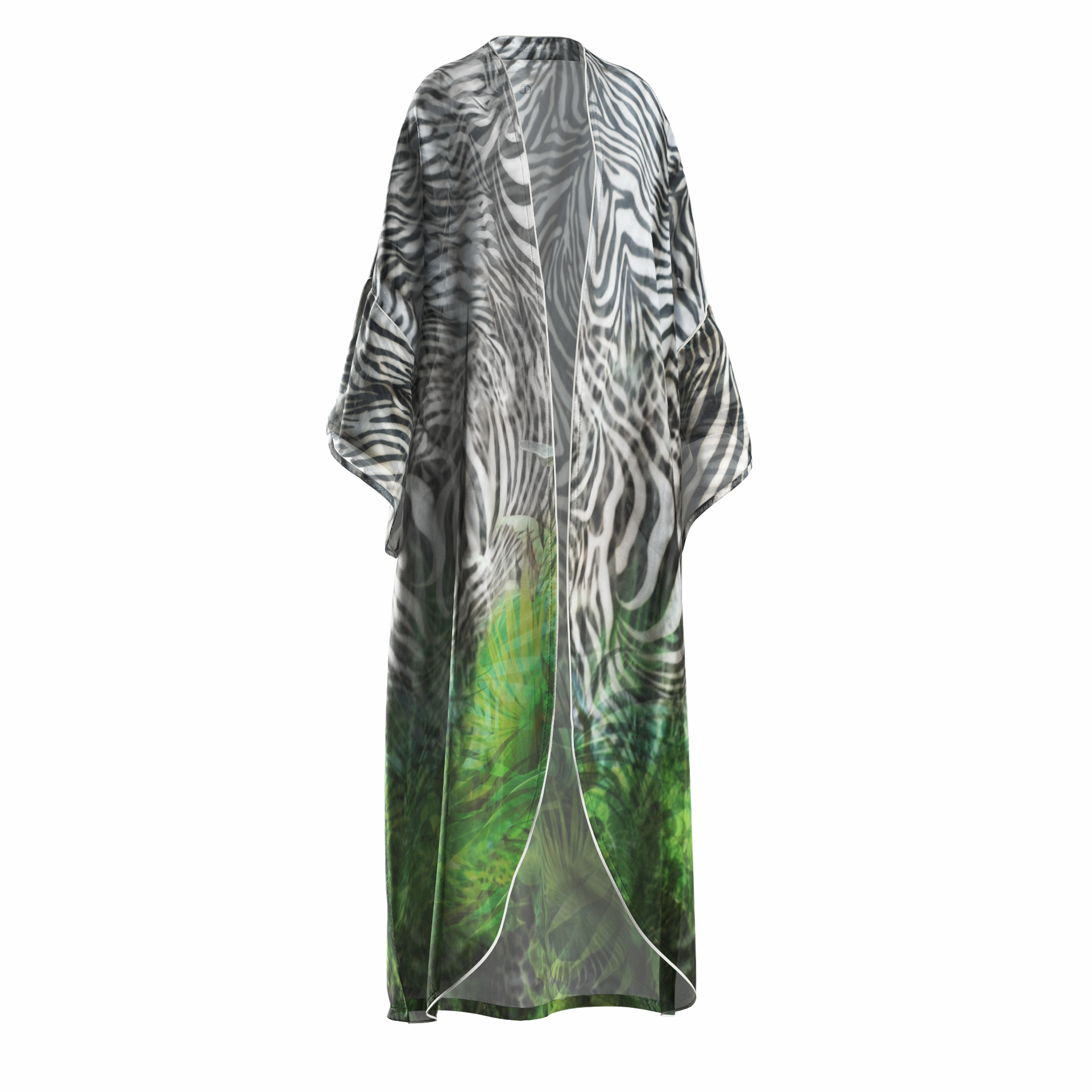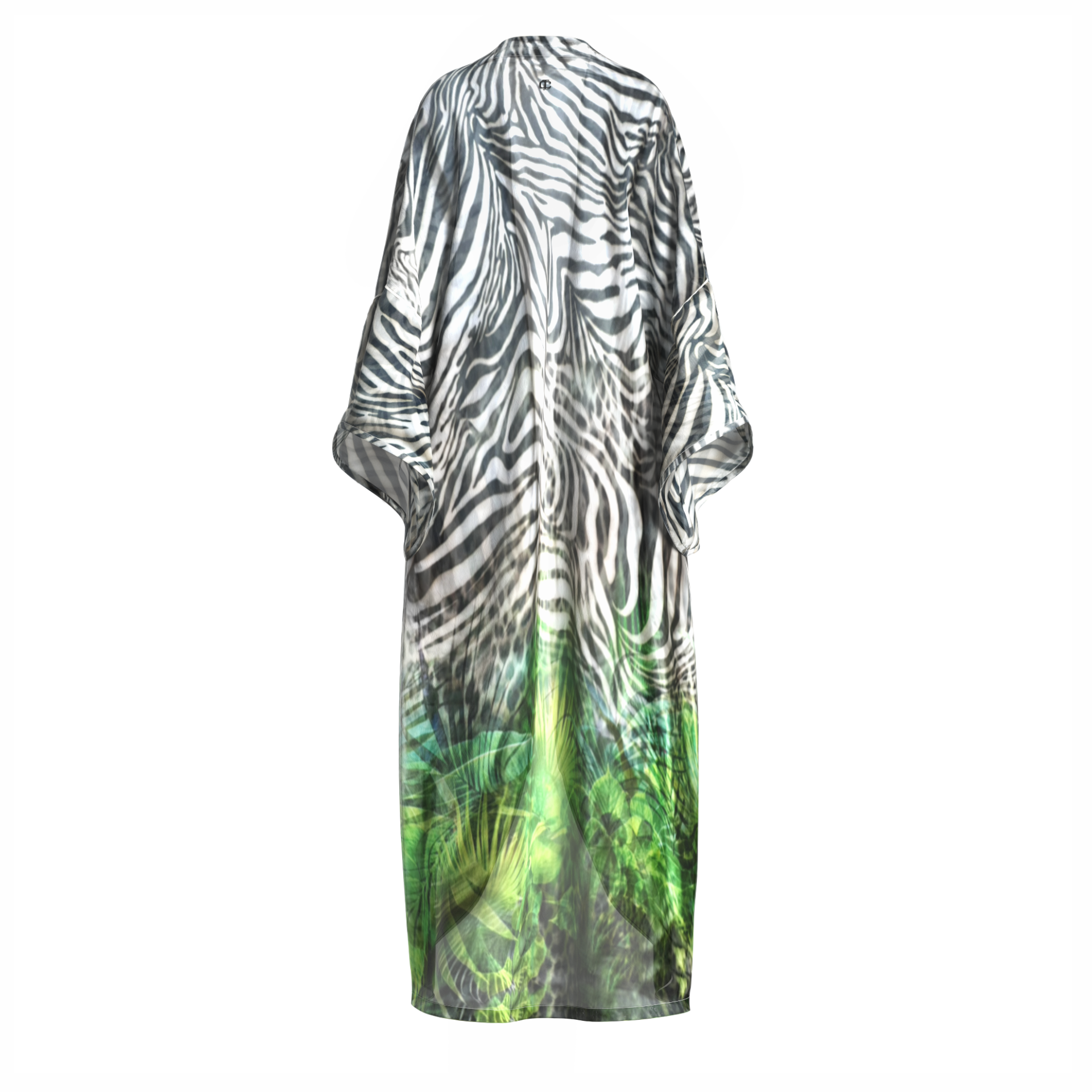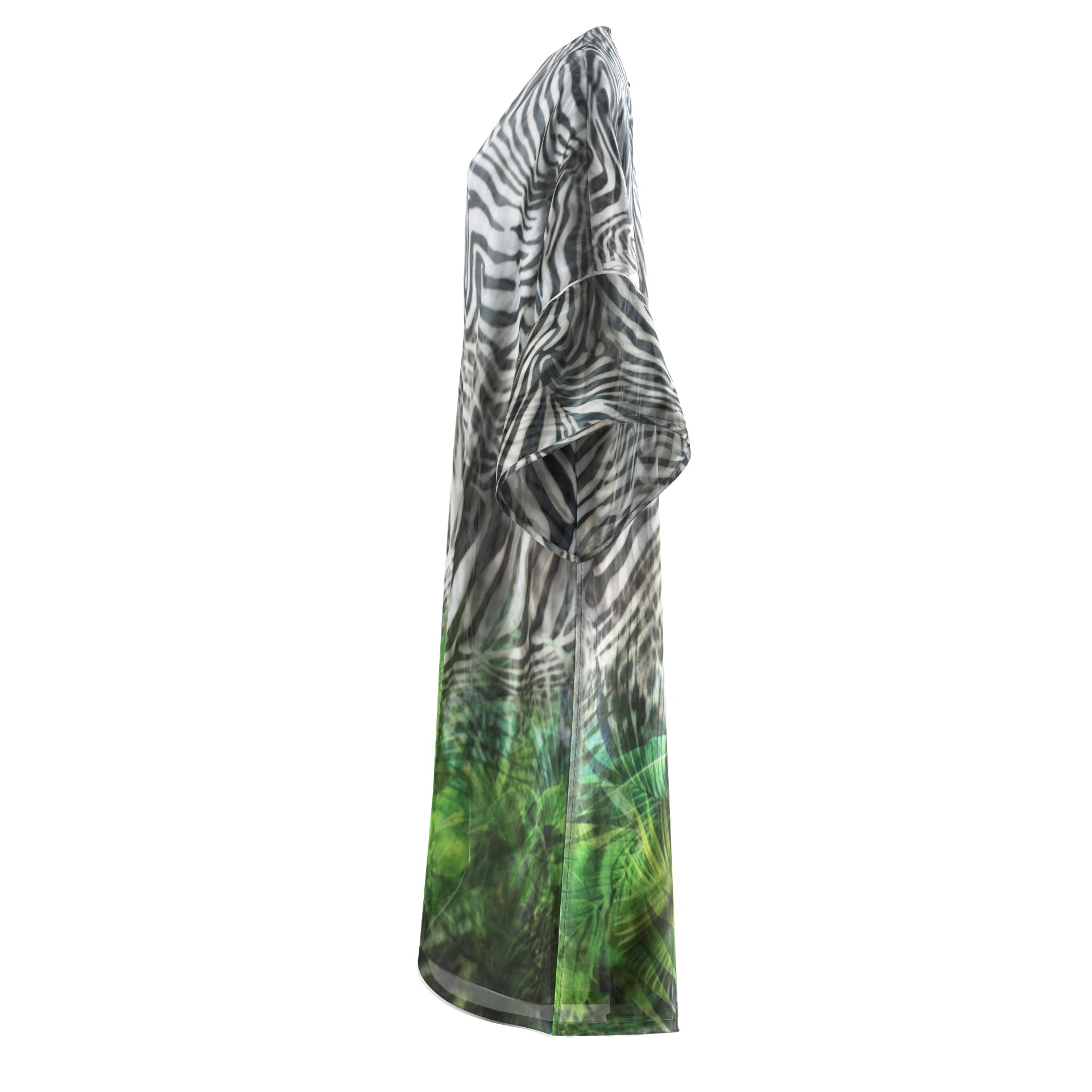 Crafted from luxurious silk, this piece showcases a bold blend of zebra and lush green foliage prints and drapes beau...