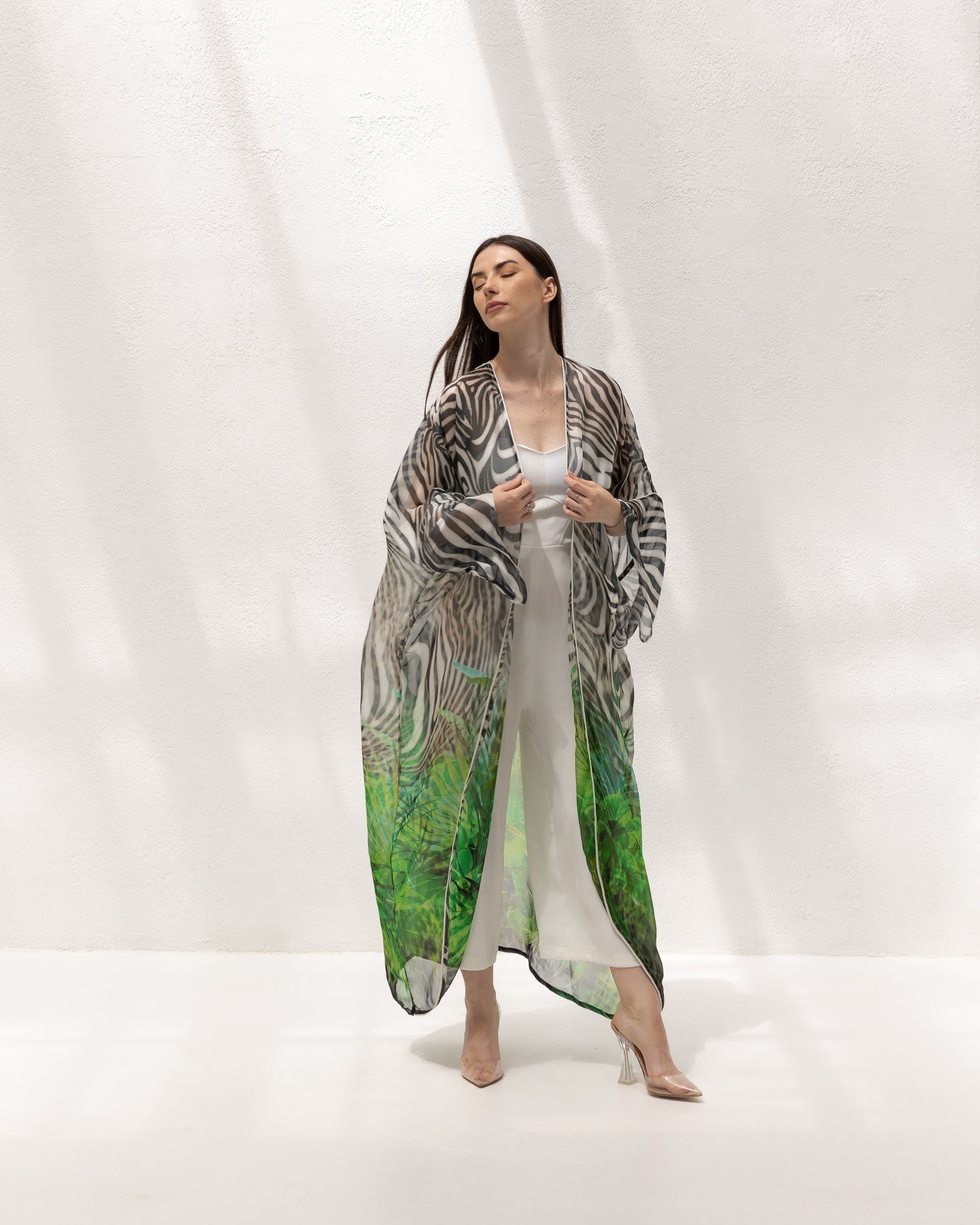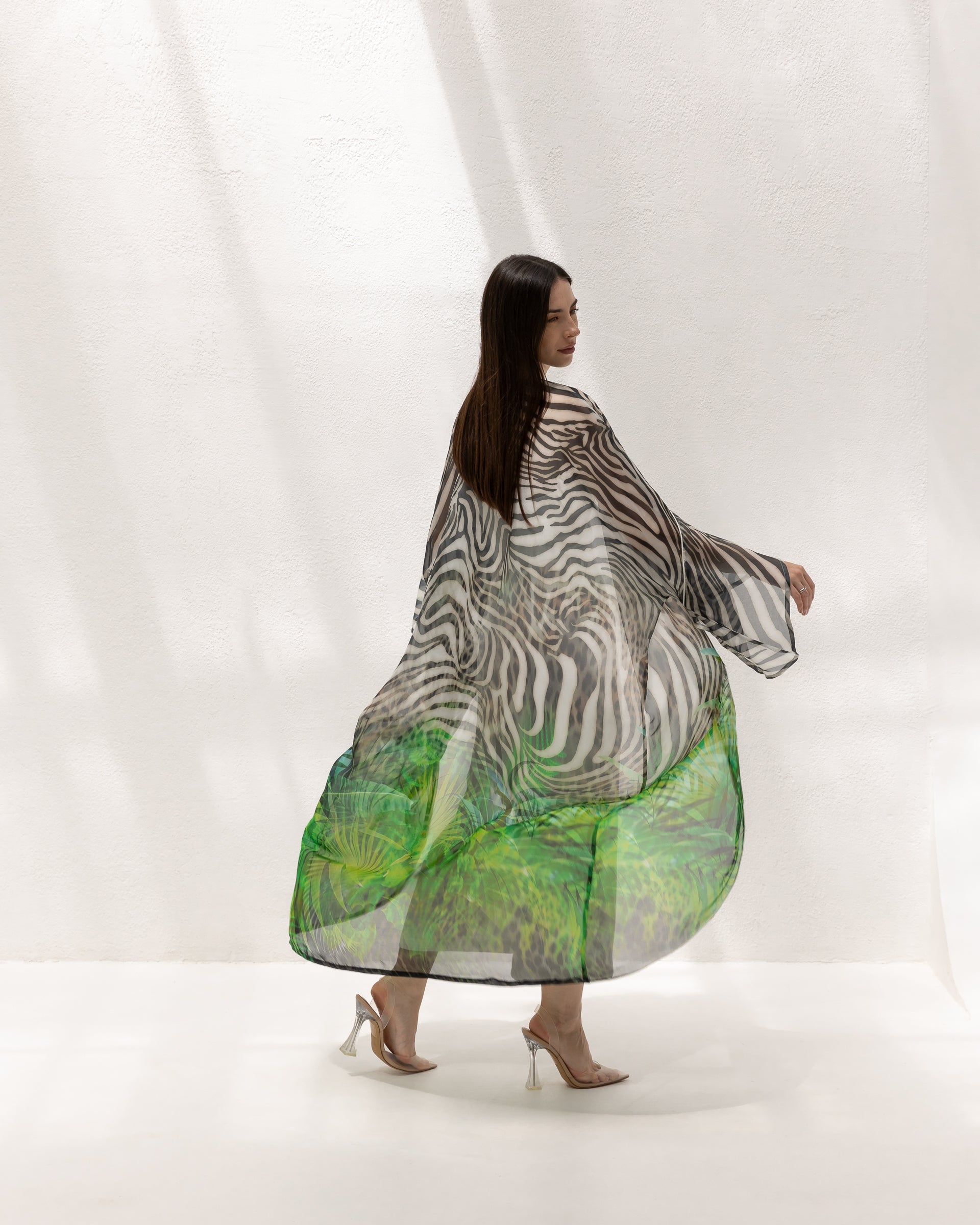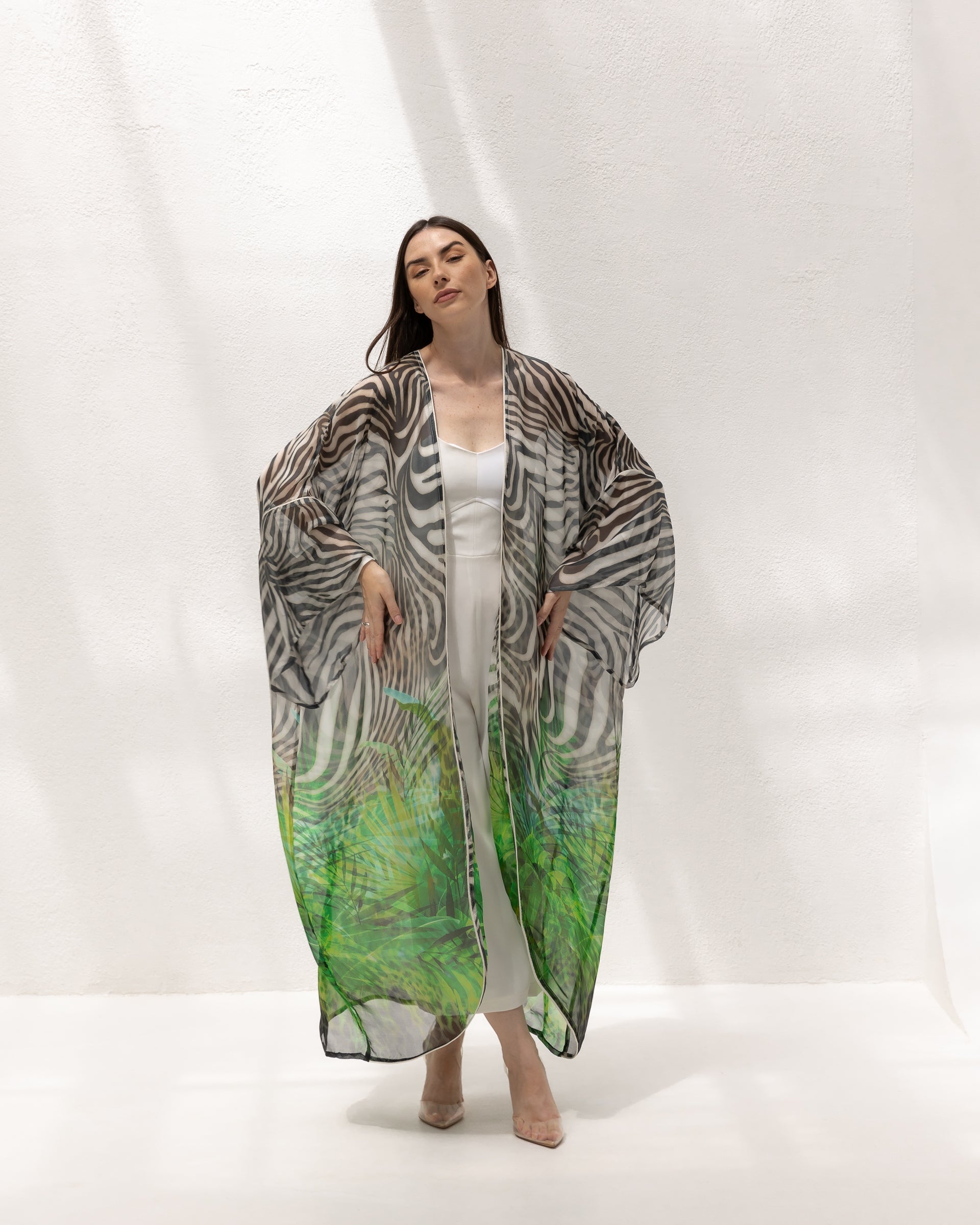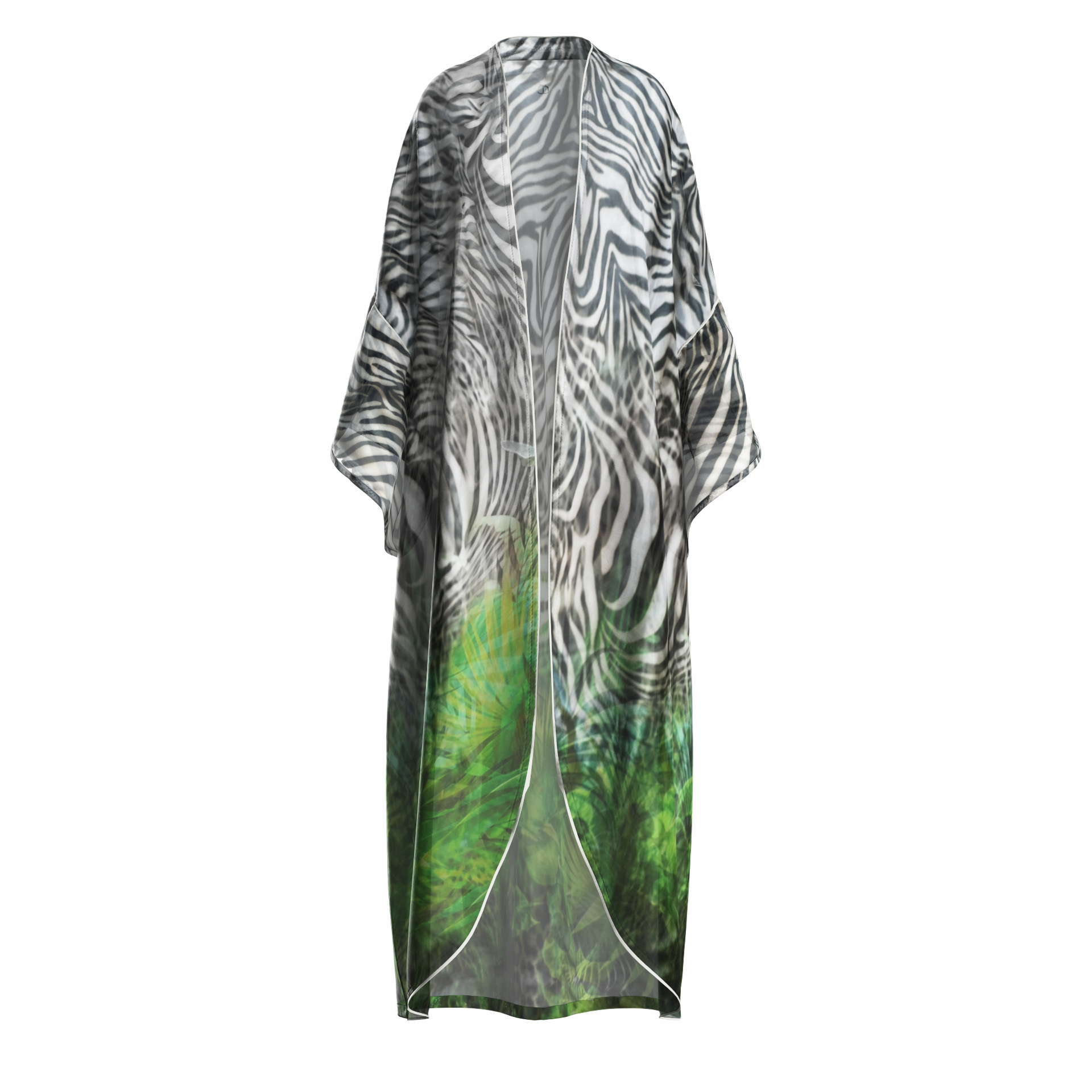 Crafted from luxurious silk, this piece showcases a bold blend of zebra and lush green foliage prints and drapes beau...