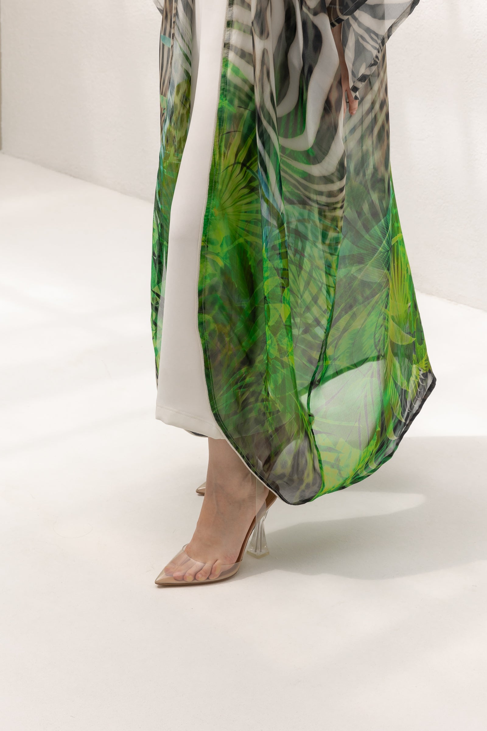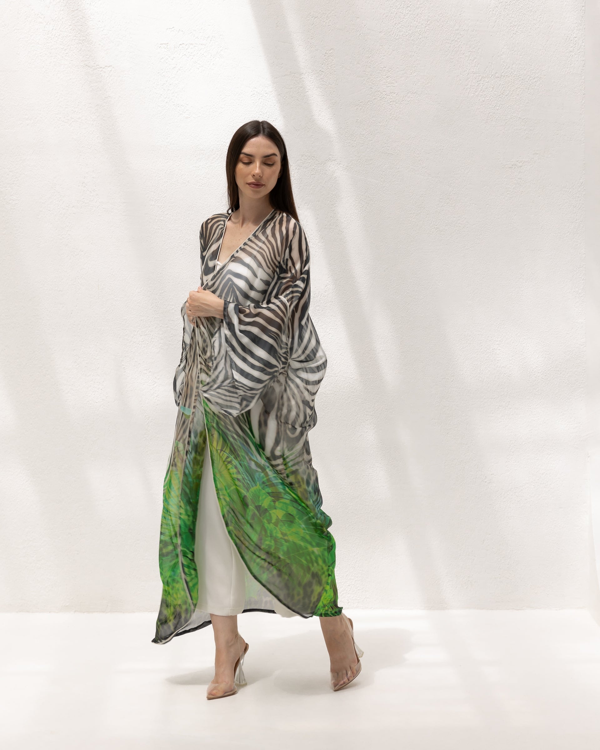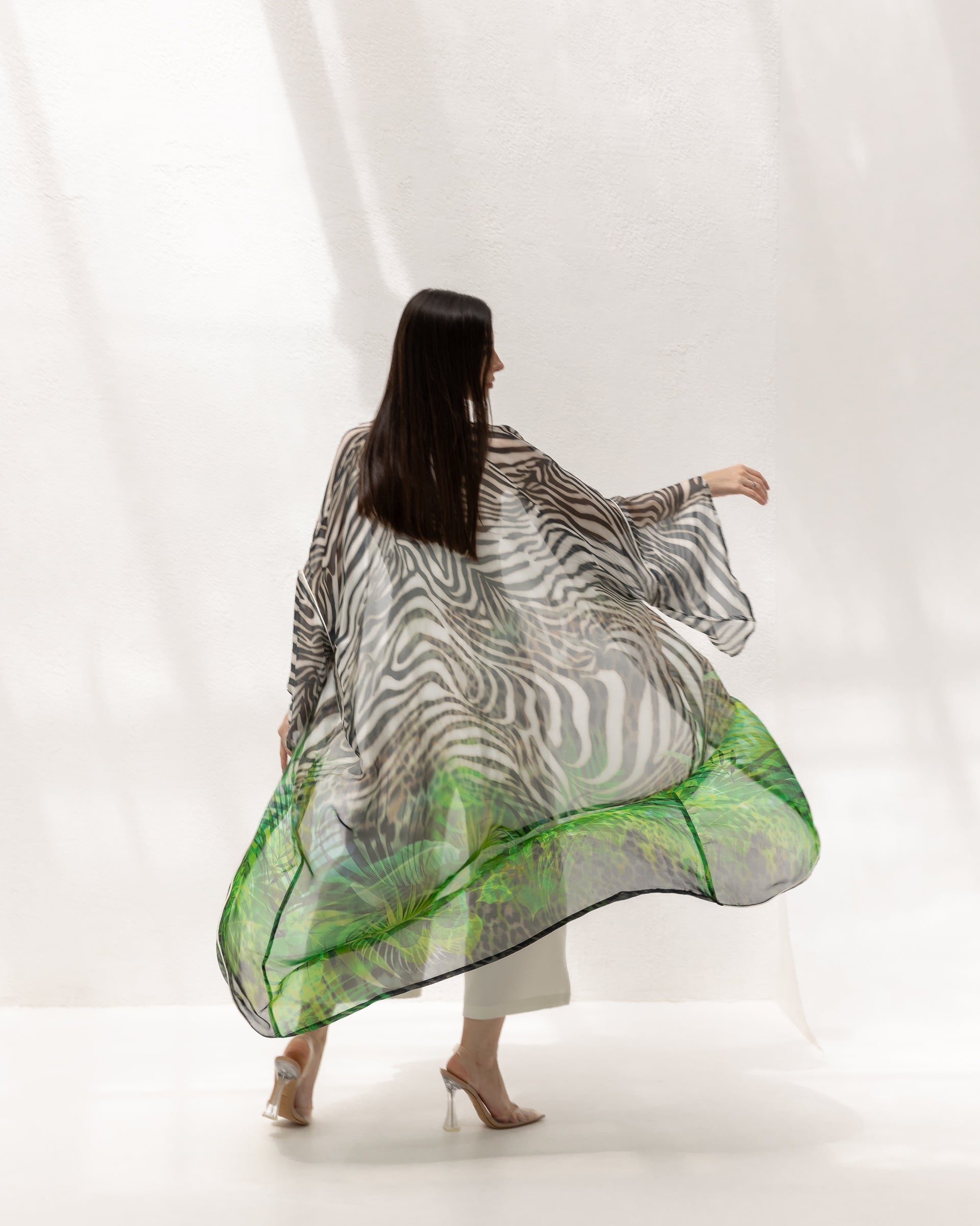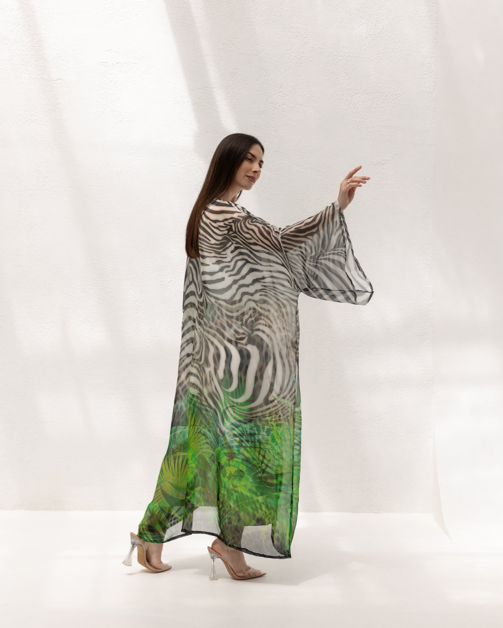 Crafted from luxurious silk, this piece showcases a bold blend of zebra and lush green foliage prints and drapes beau...