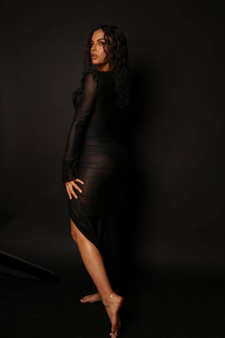 A form-fitting sheer maxi gown with long sleeves and adjustable ties on the chest and wrists. This versatile piece is...