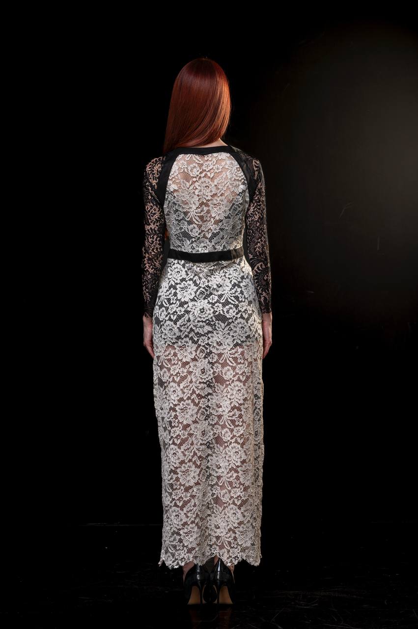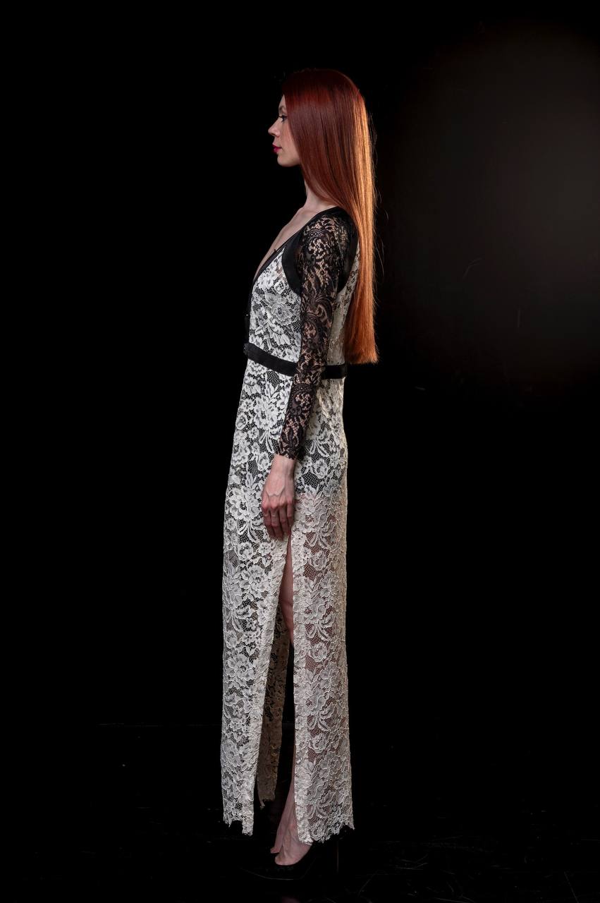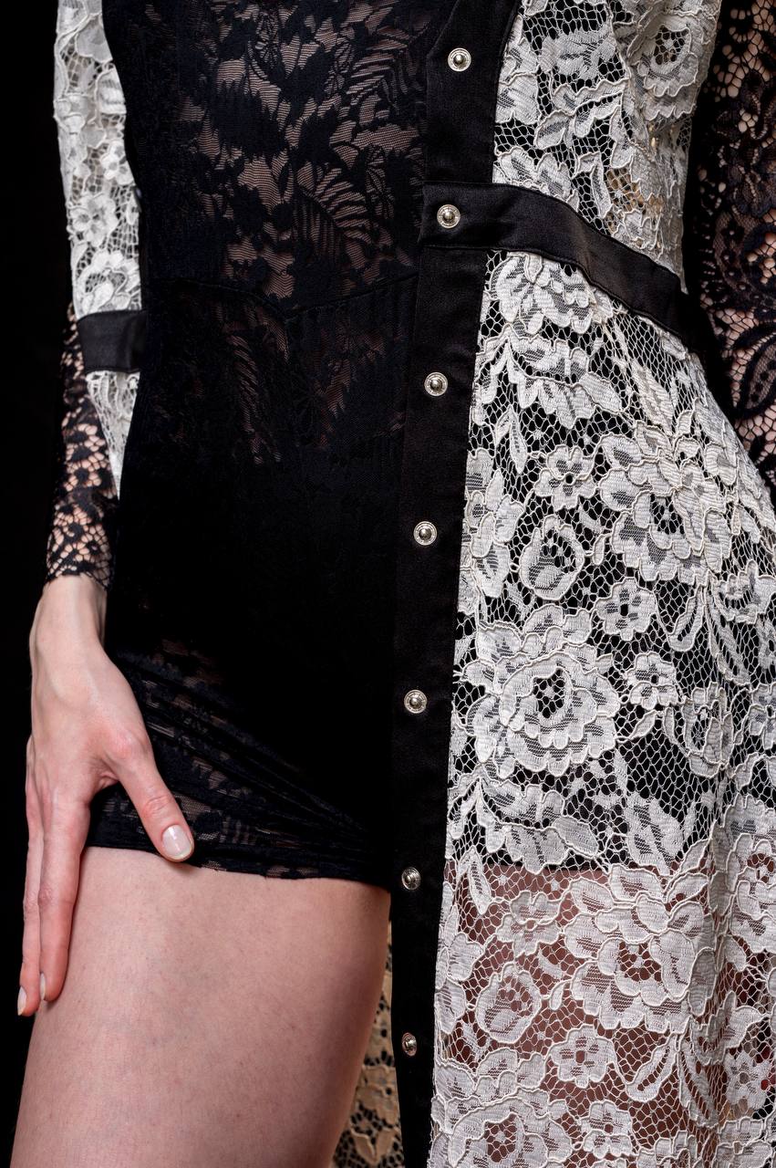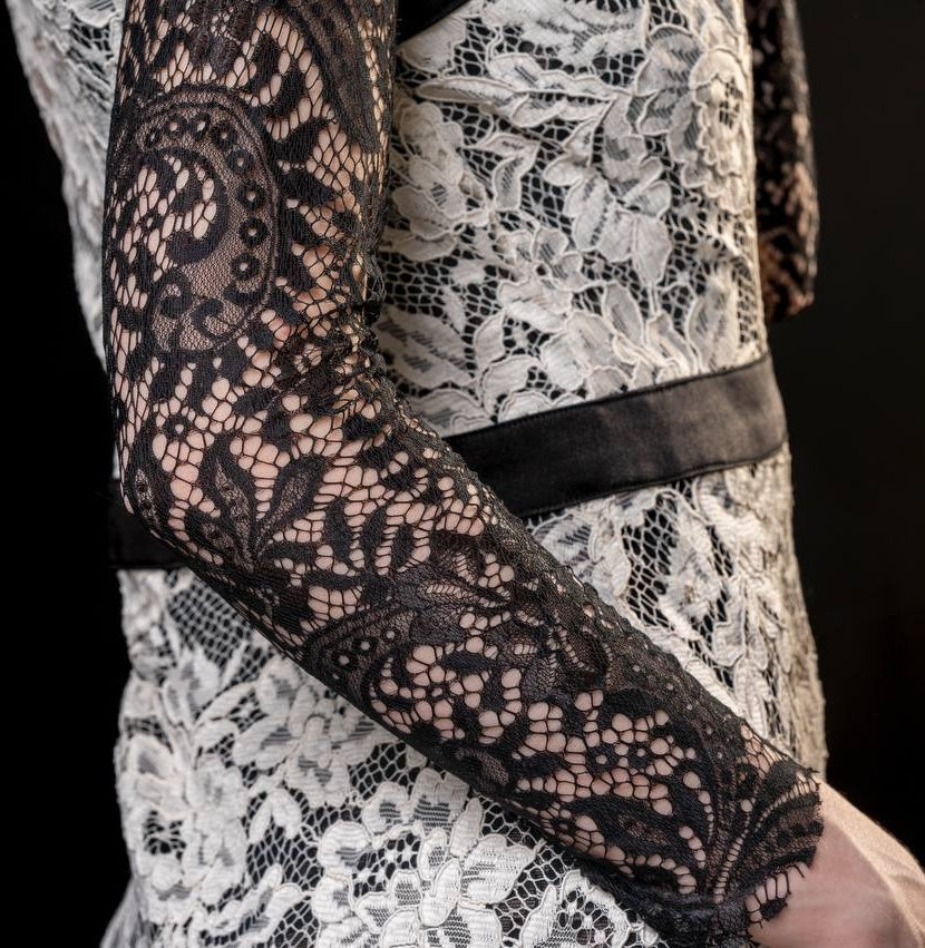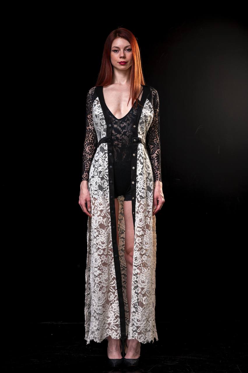 The XTWILIGHT Lover cover-up is an edgy piece crafted from off-white guipure lace, with black lace accents on the arm...