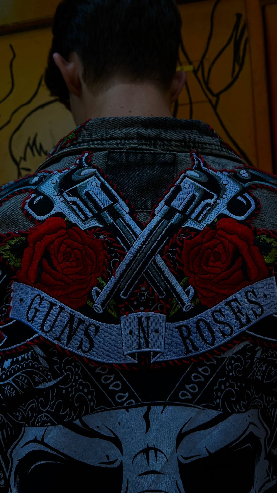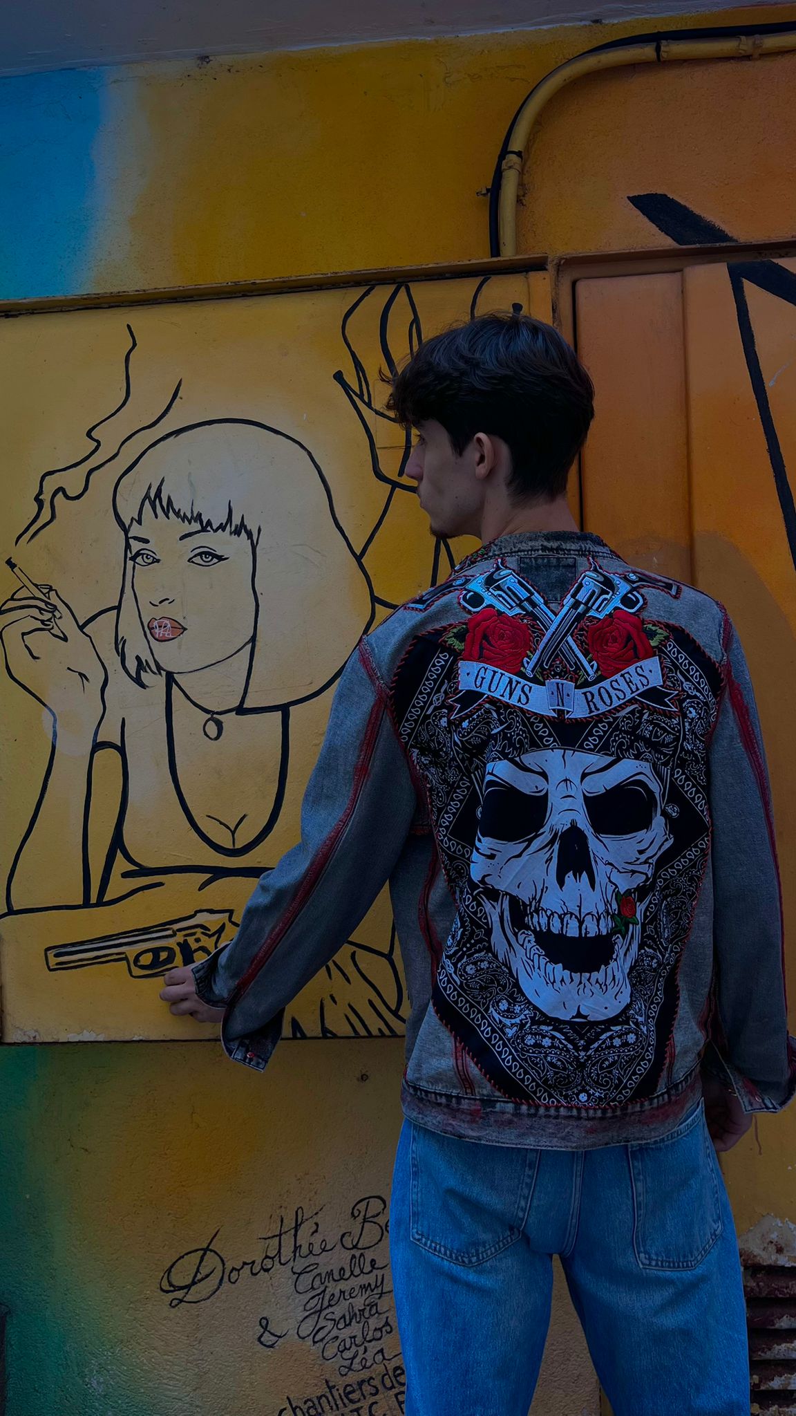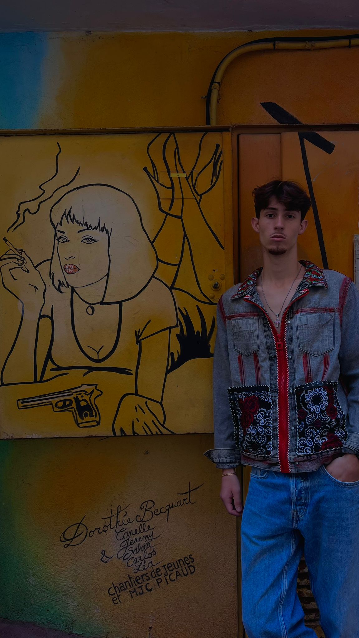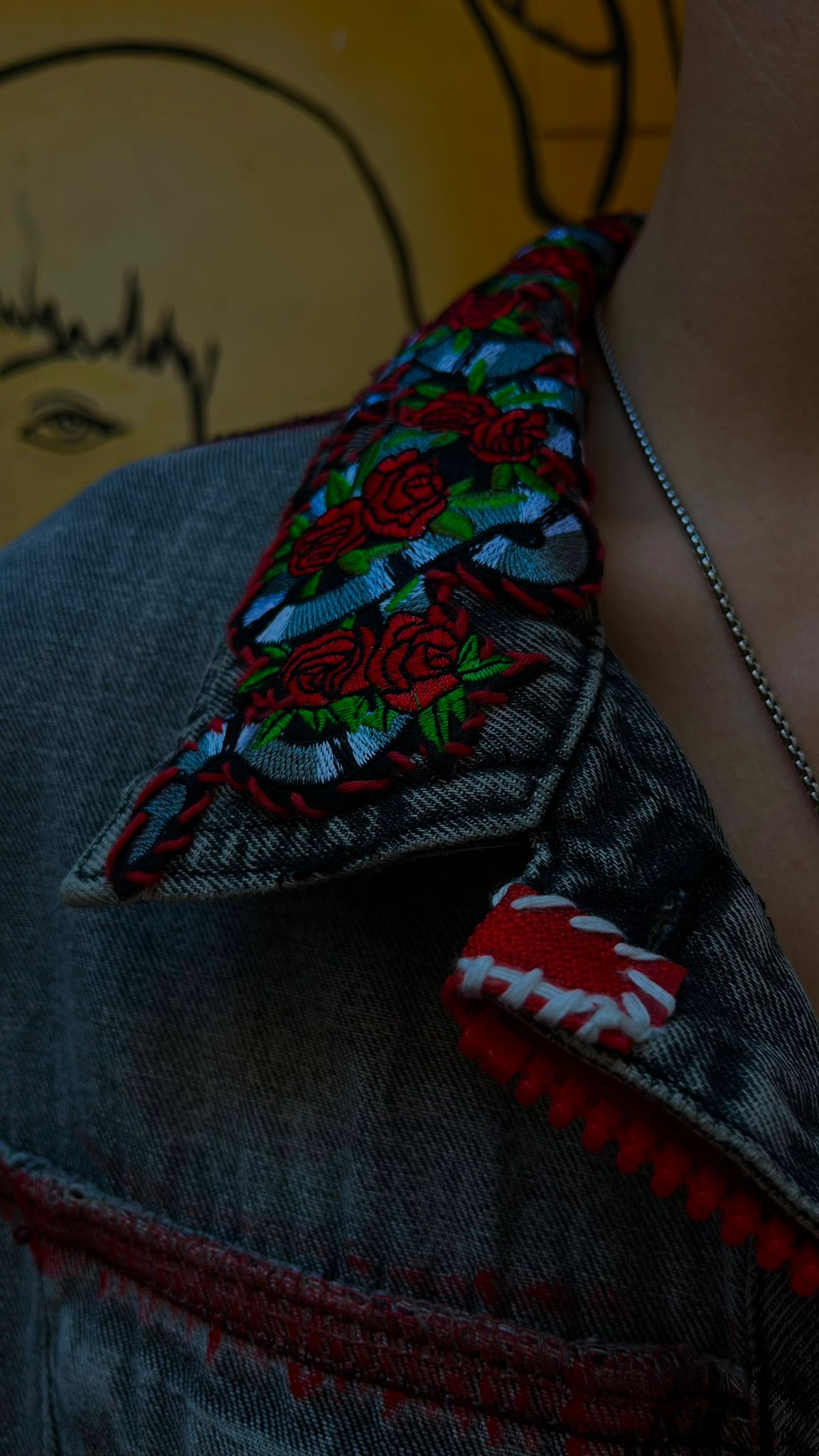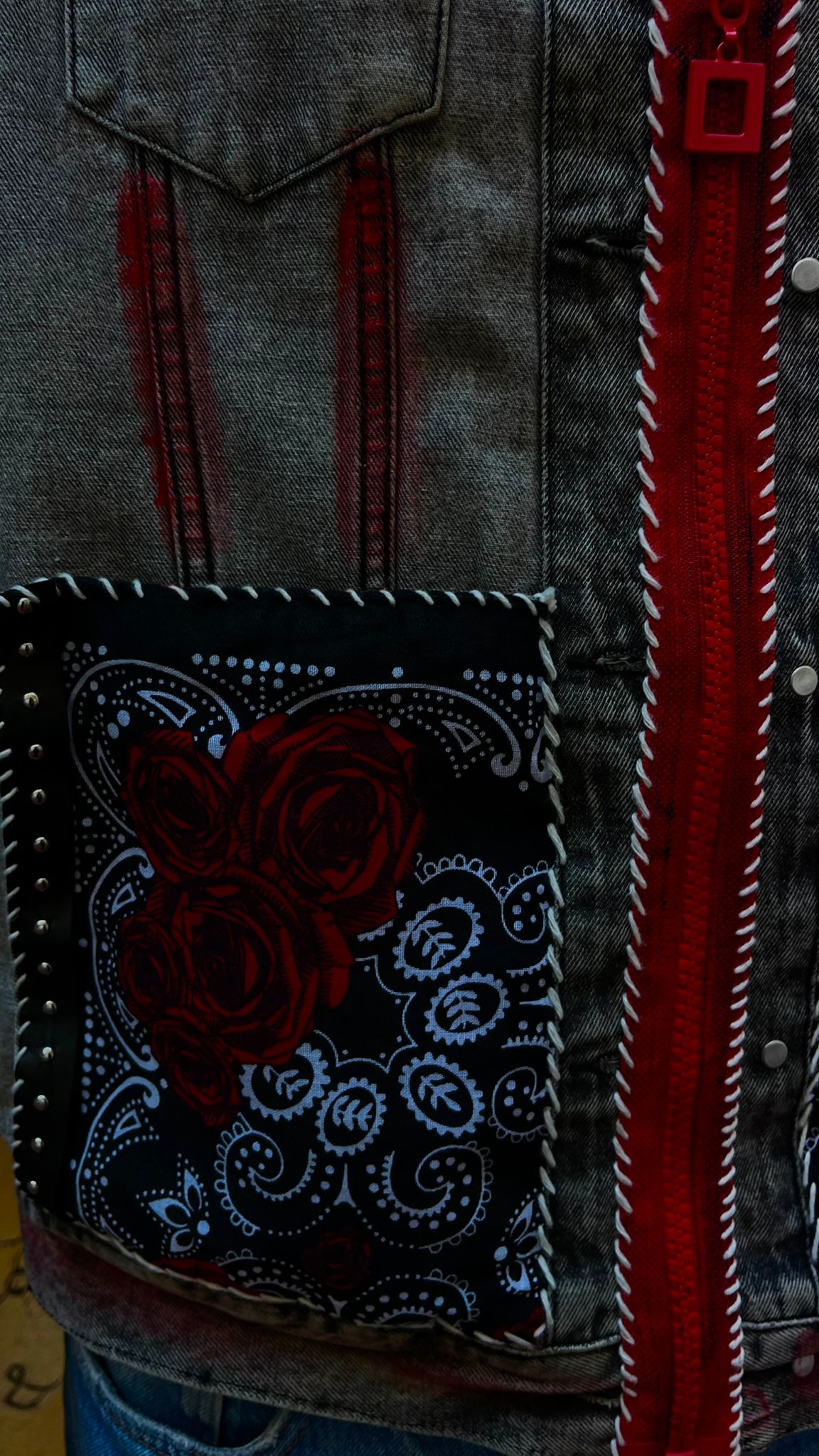 Crafted from premium washed denim, it features bold red topstitching, intricate embroidered panels, and contrasting b...