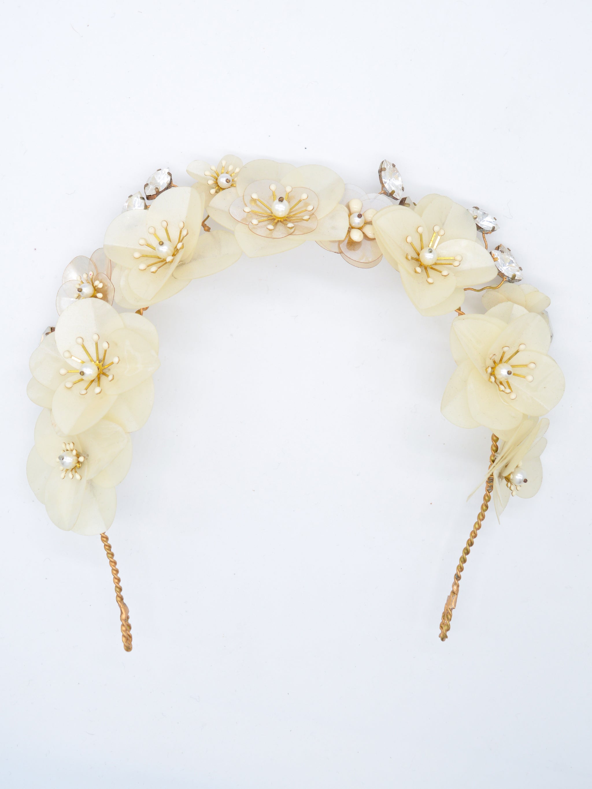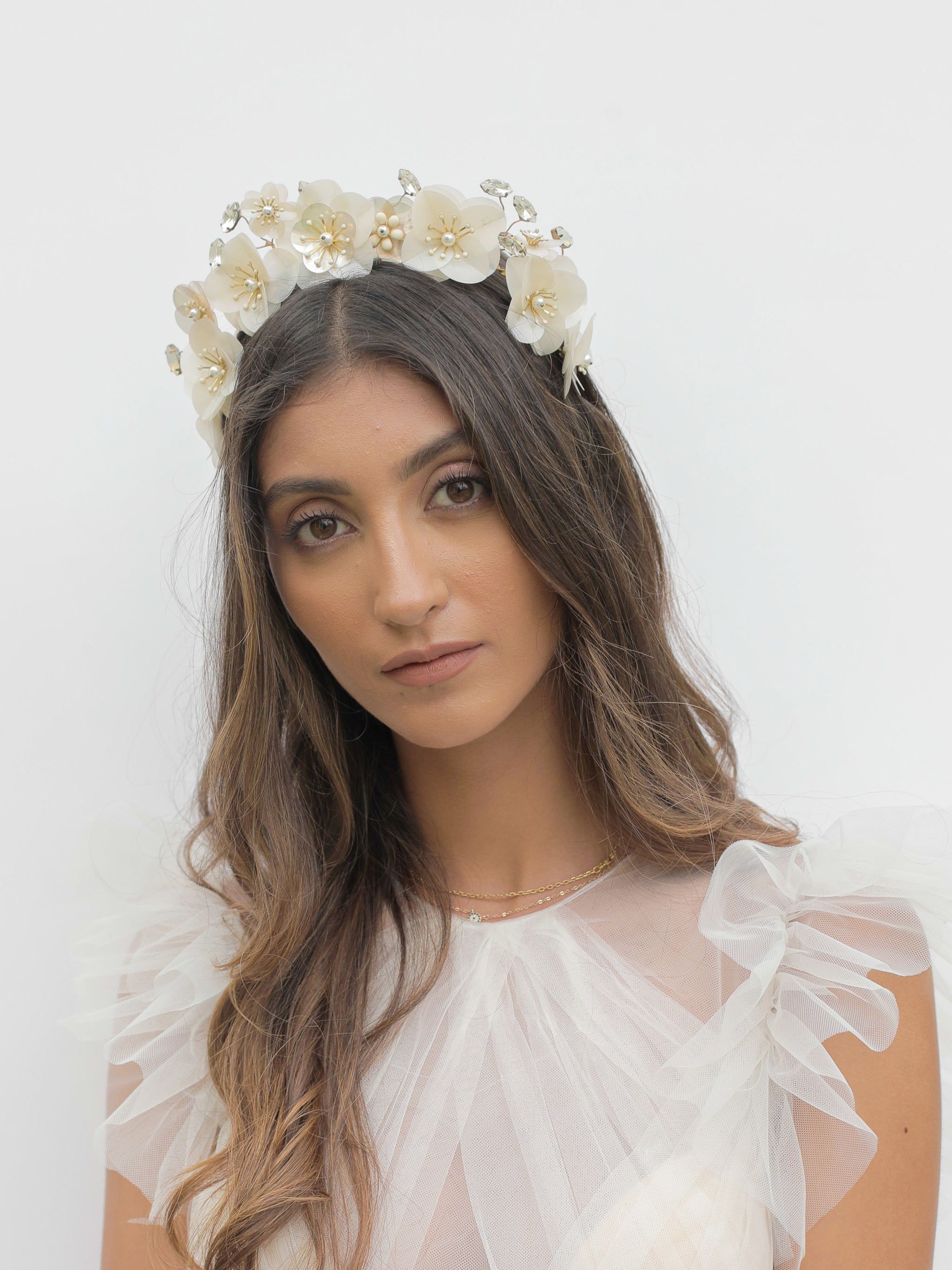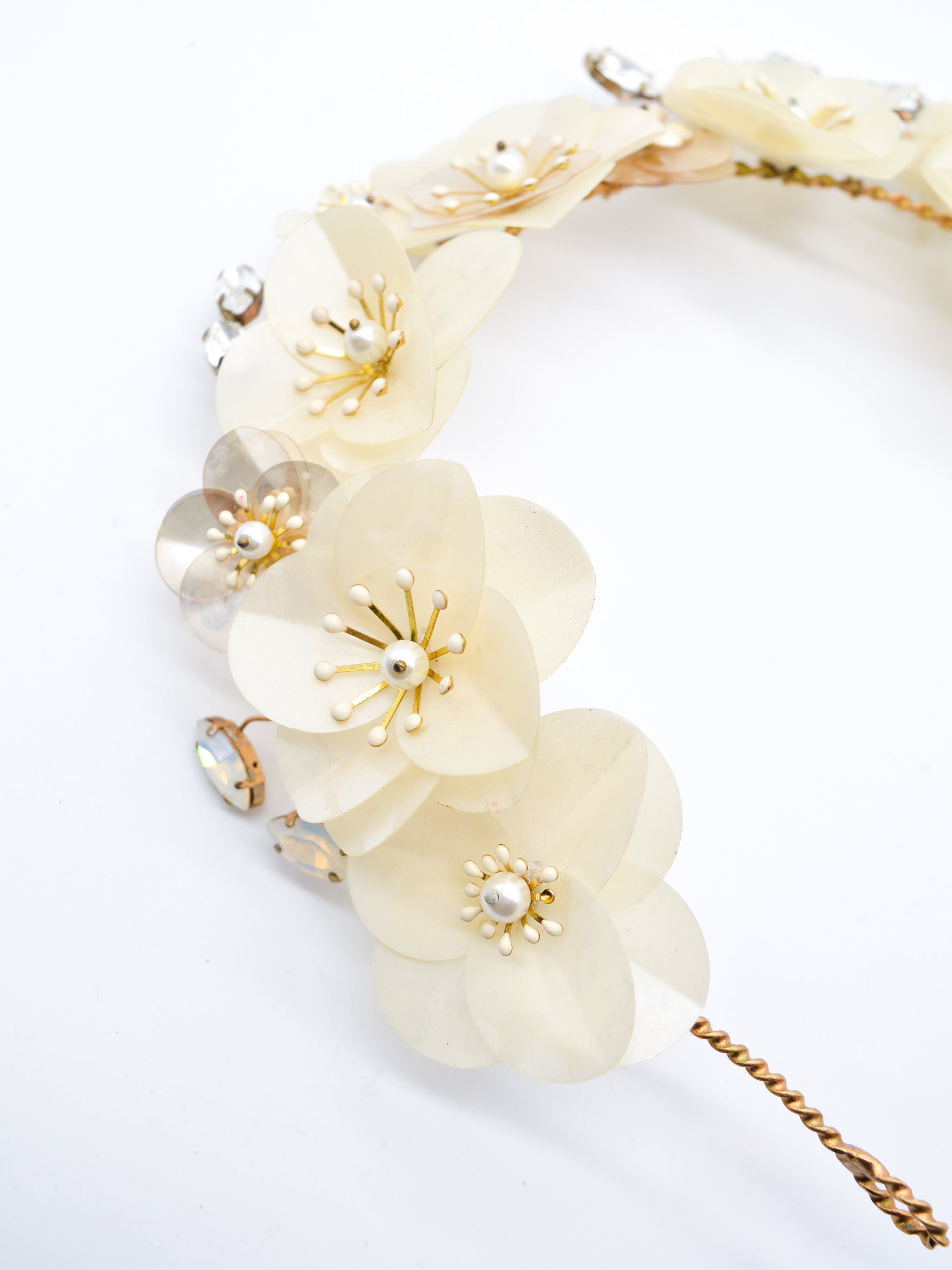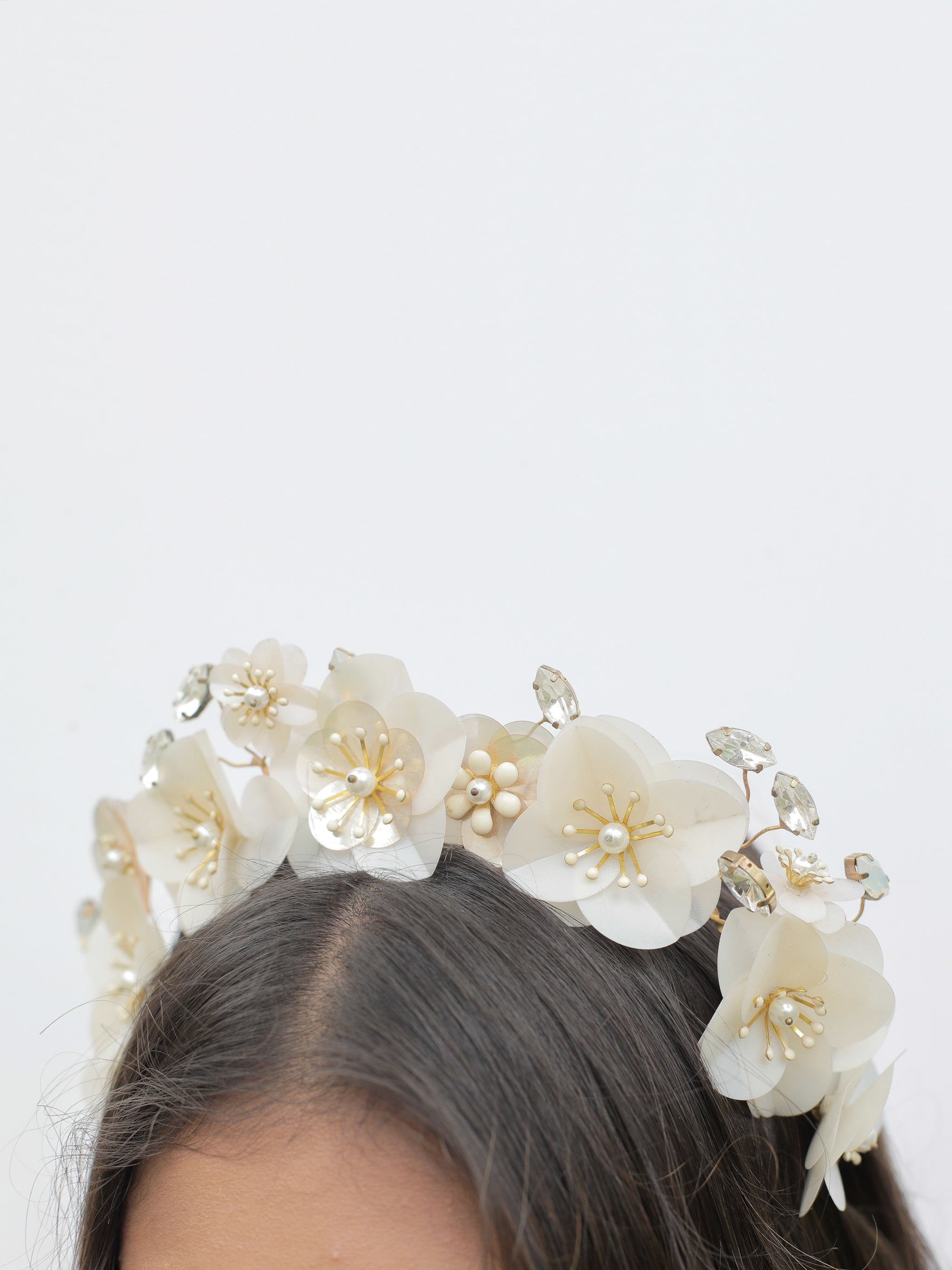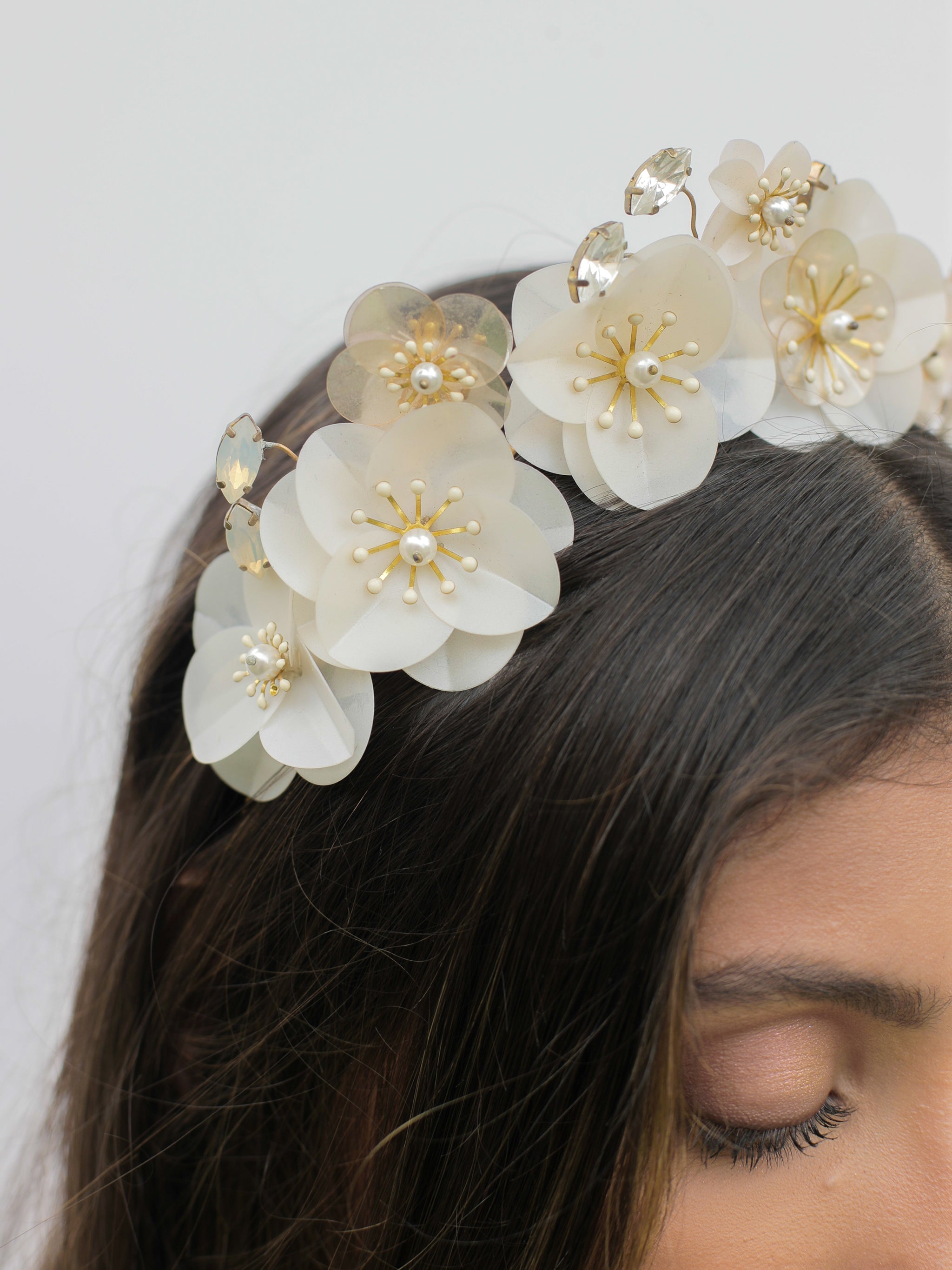 Handmade artisanal headpiece featuring white paper and acrylic flowers with a pearl center and set with Swarovski cry...