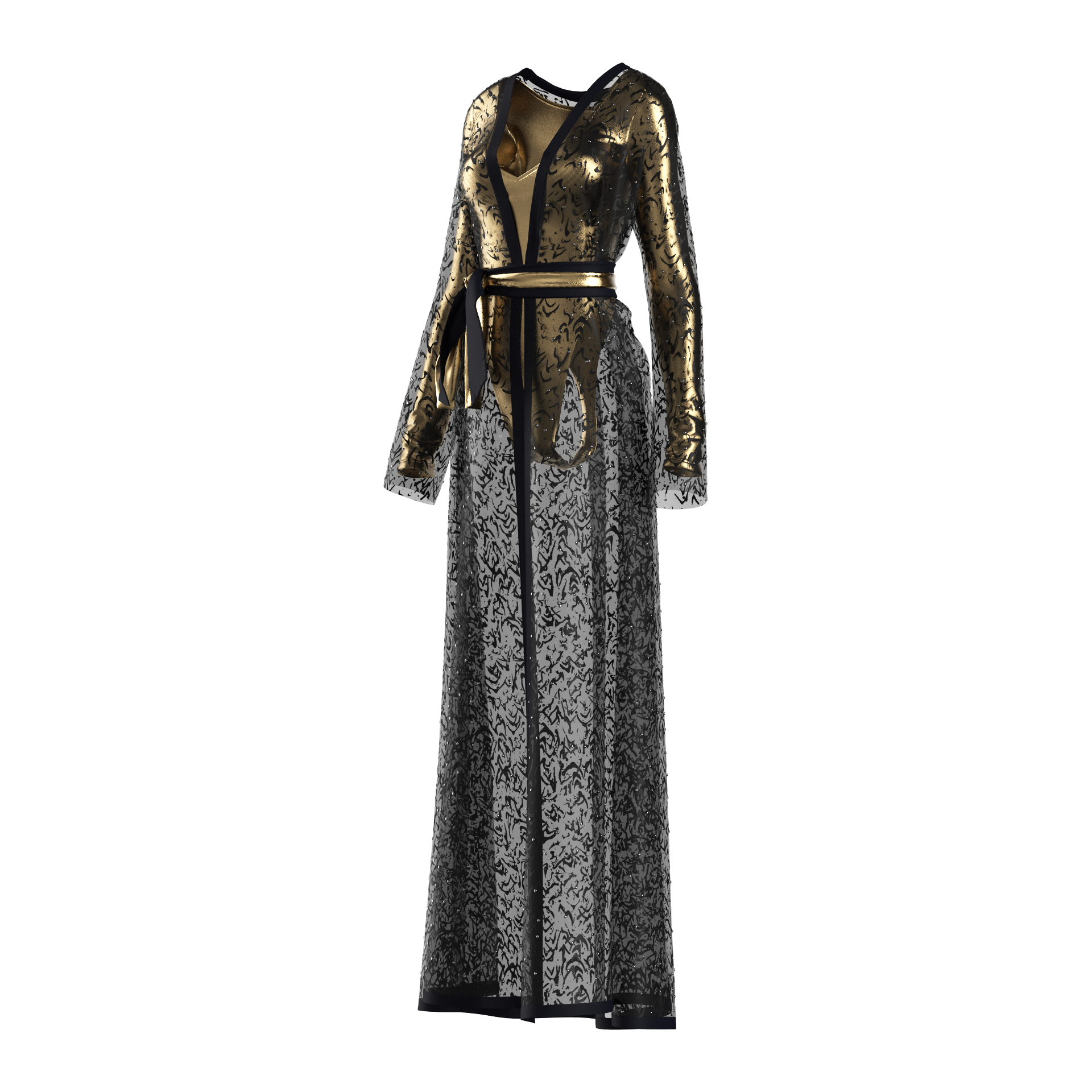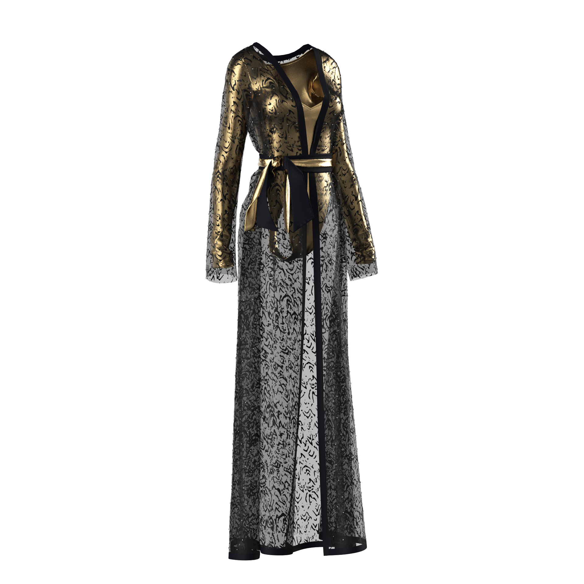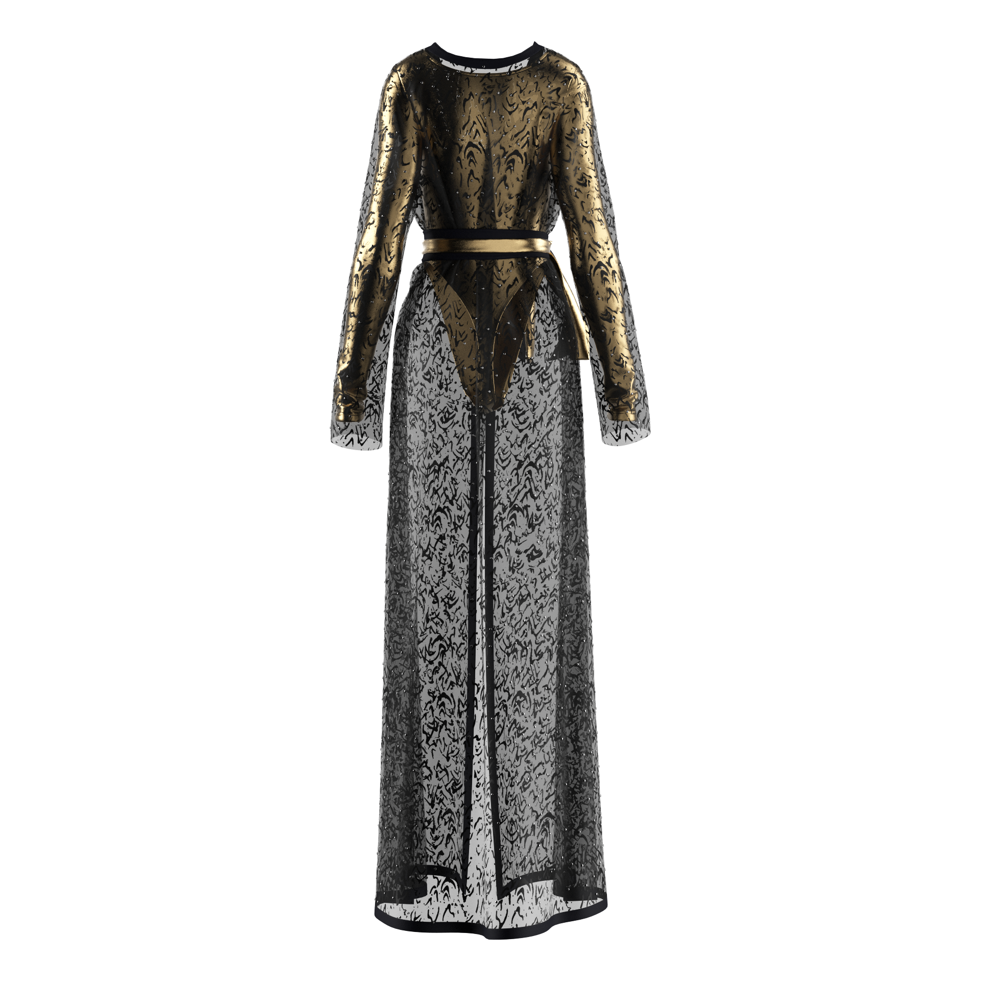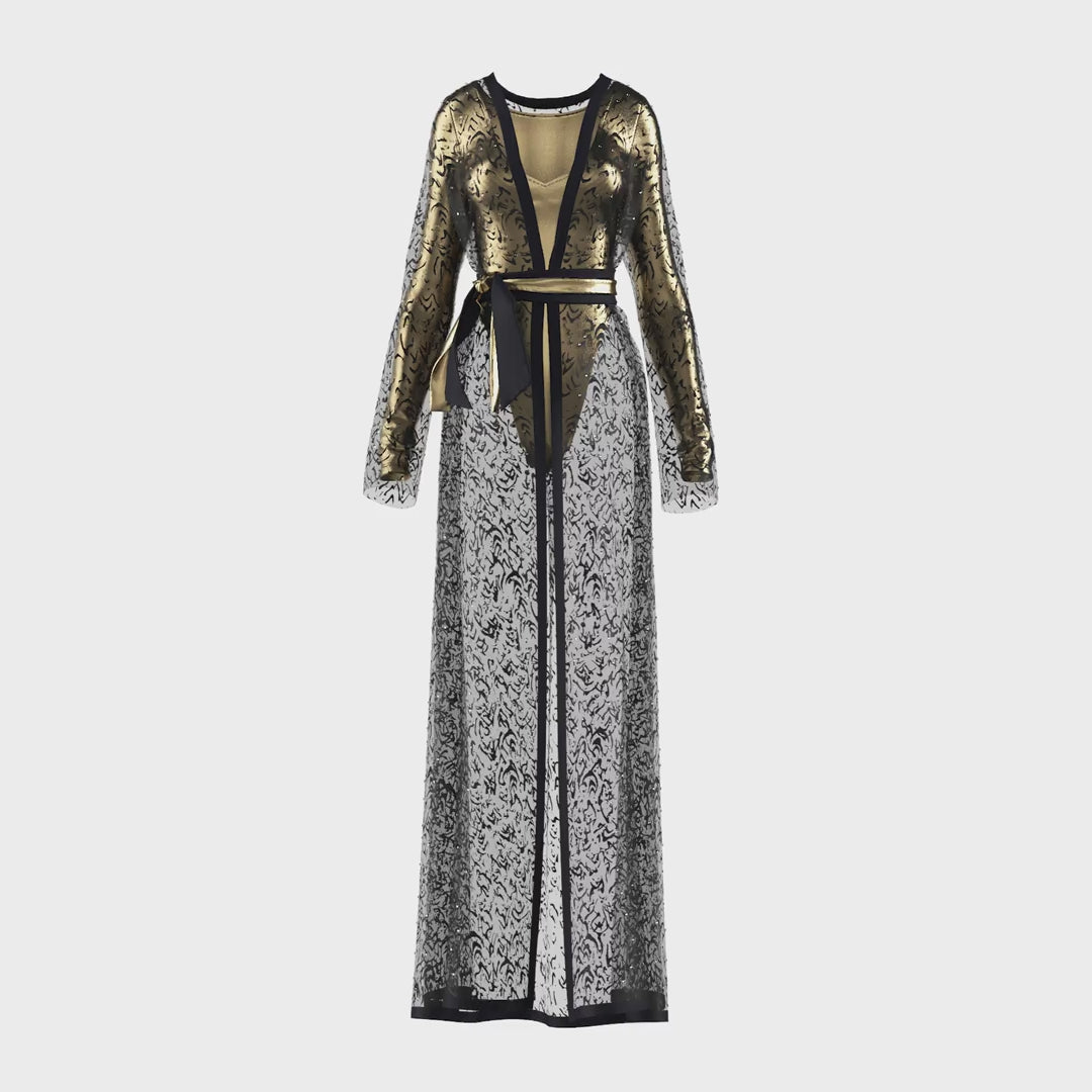 Elegantly crafted with delicate bling studs and handmade suede feel stripes. Maxi length, long sleeves, and included ...