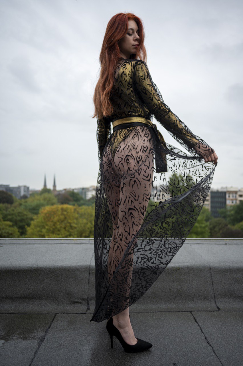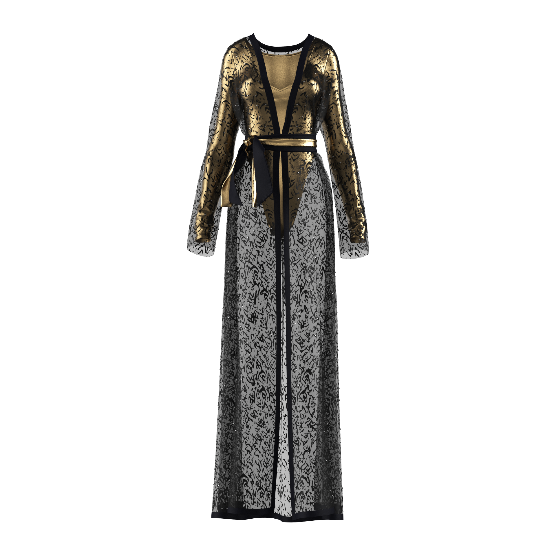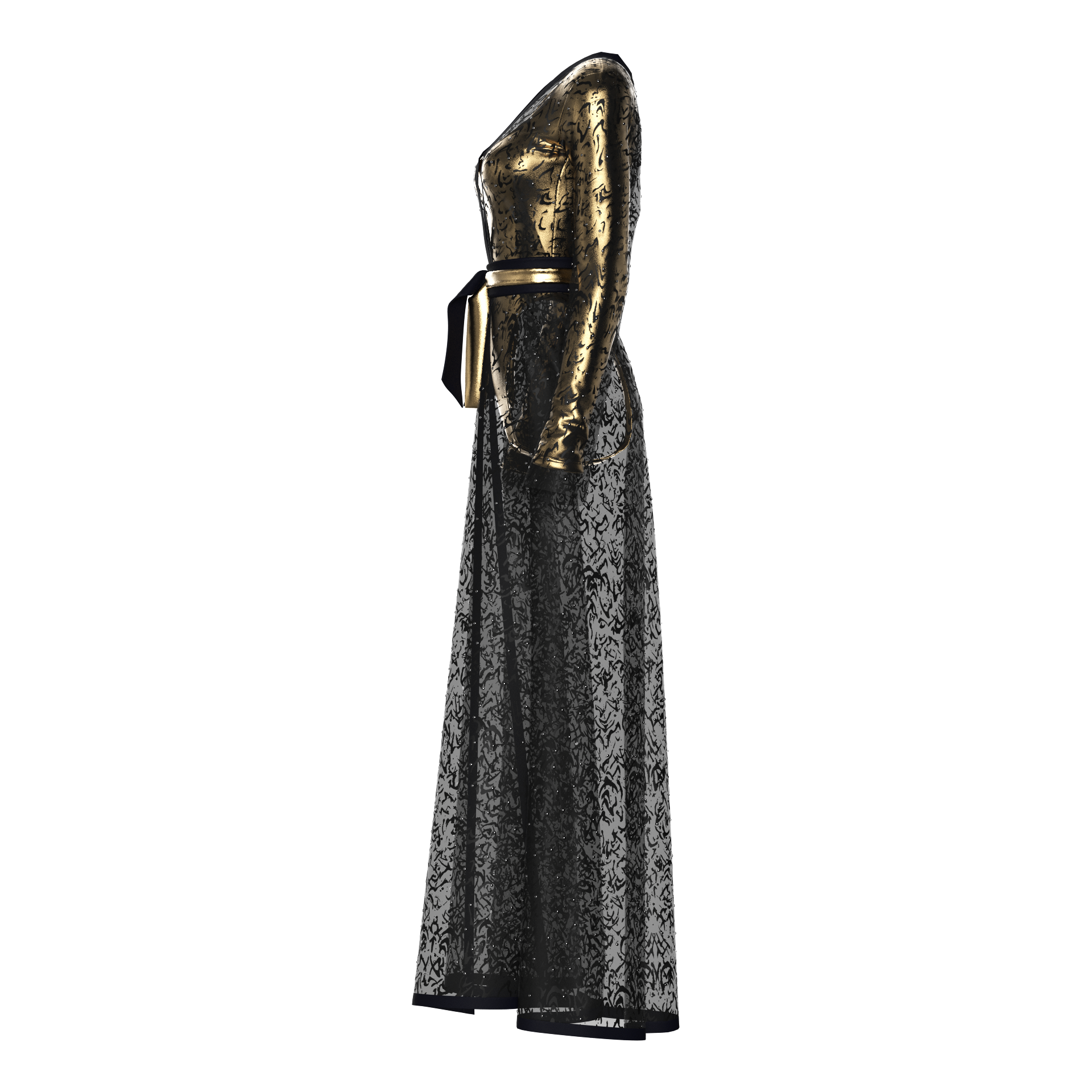 Elegantly crafted with delicate bling studs and handmade suede feel stripes. Maxi length, long sleeves, and included ...