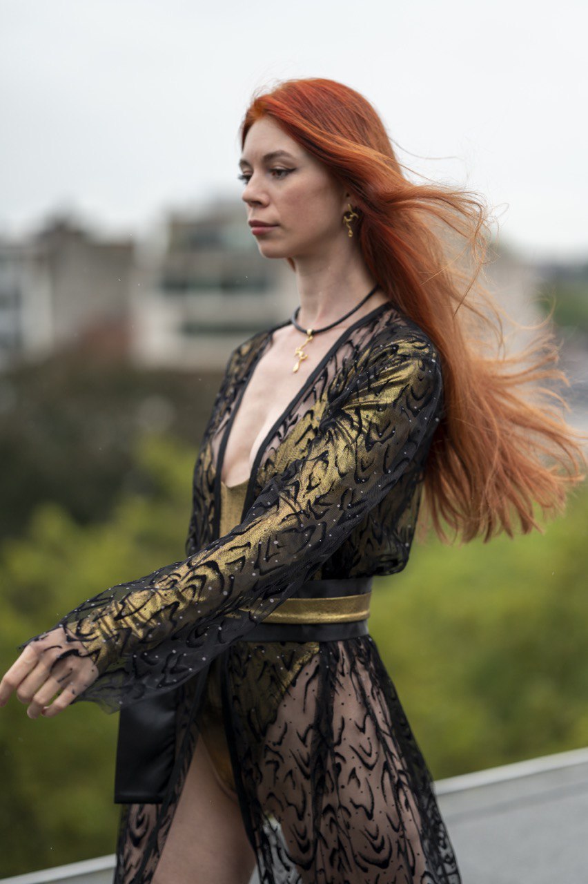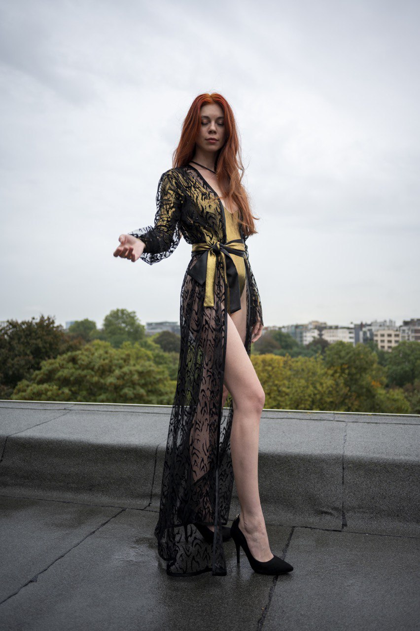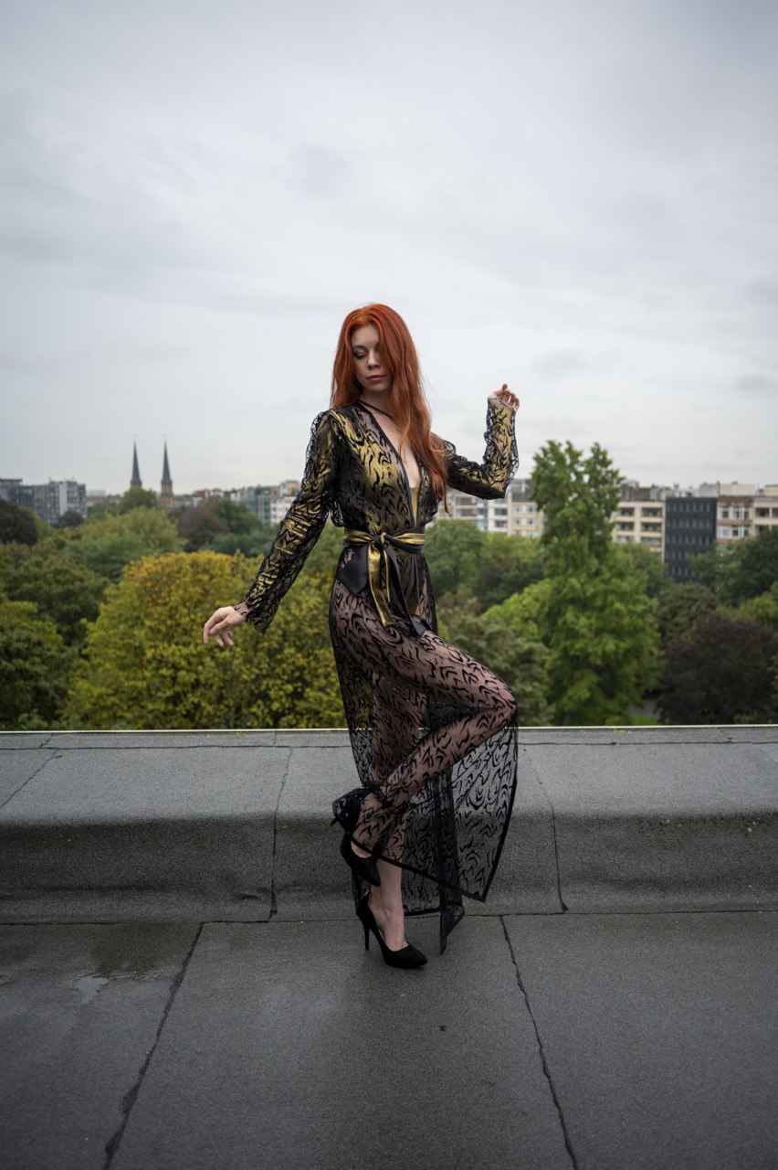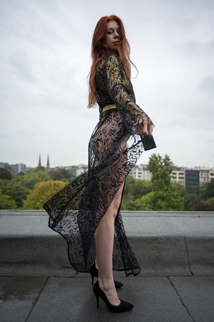 Elegantly crafted with delicate bling studs and handmade suede feel stripes. Maxi length, long sleeves, and included ...